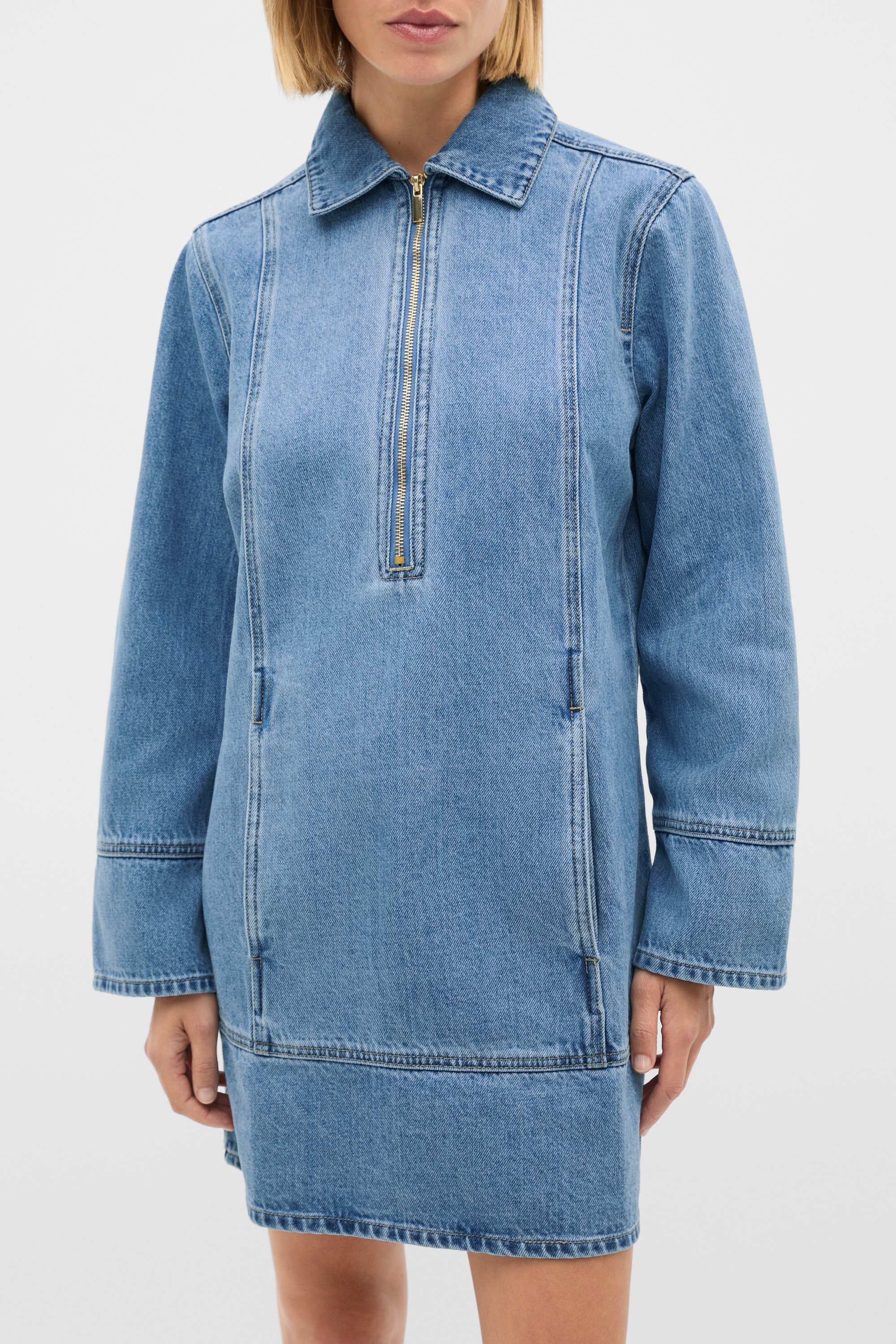 Perfect on its own through the warmer months, perfect when layered for the cool change, this denim mini is set to be a new favourite in your wardrobe. Crafted in premium cotton in a medium weight denim, it features a collar, long sleeves and a statement gold zip at the front. It also has vertical pockets.