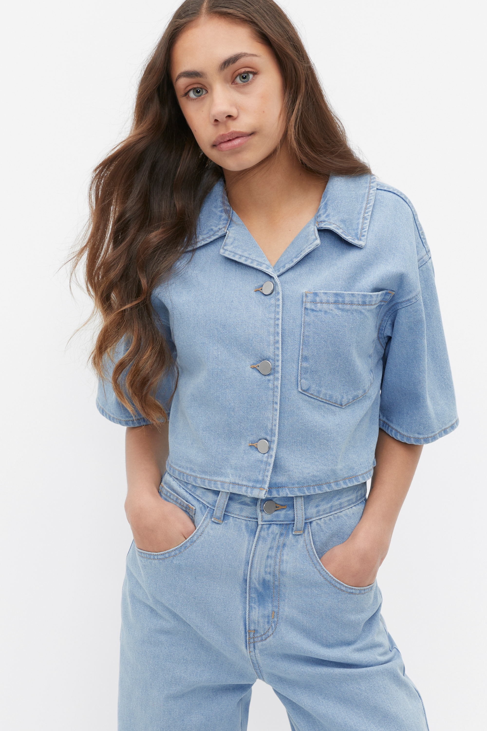 On trend and easy to style, this overshirt is set to be her new favourite. Crafted from classic rigid denim, it features a boxy fit, with a collar, a button front, dropped shoulders, short sleeves, and a front patch pocket. It can be worn with the matching cuff shorts or straight jeans for a double-denim look.