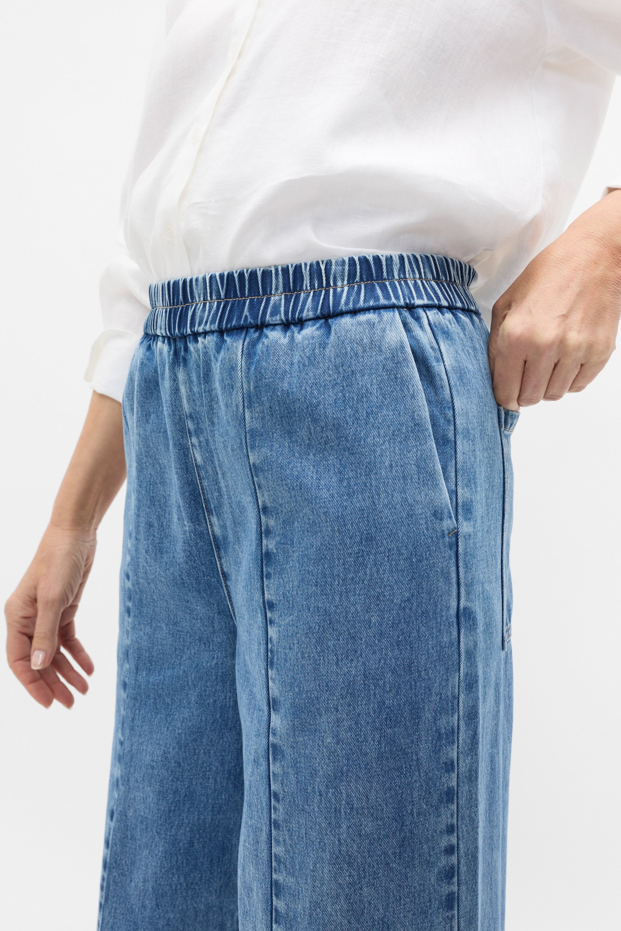 Comfortably chic, these pull-on jeans are a handy addition to your everyday styling. Crafted in premium cotton, they feature an elasticated waistband, pockets and a wide leg shape.