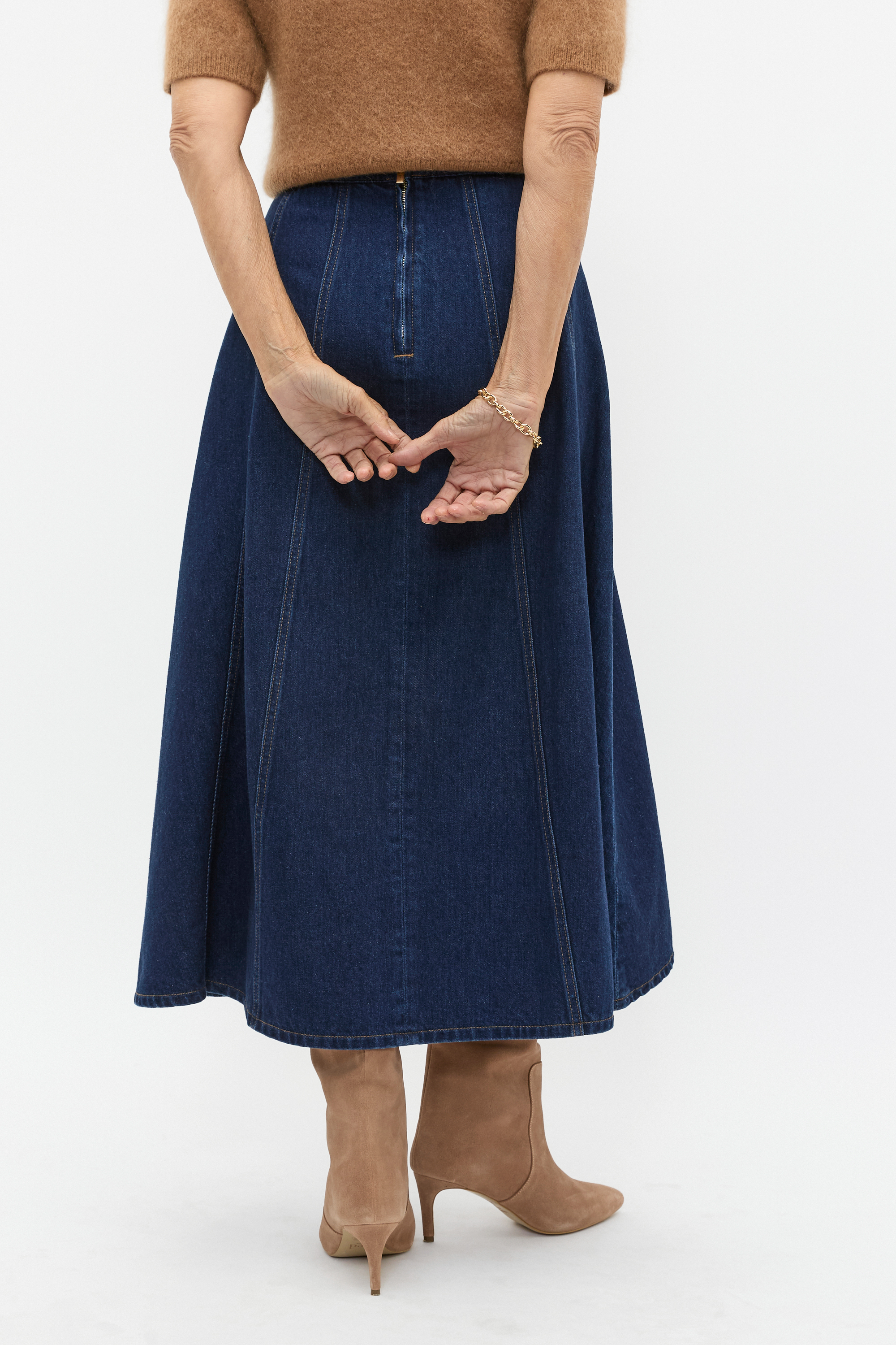 A classic style for the modern wardrobe, this skirt features a panelled design finished with contrast stitching and gold hardware. Crafted in premium cotton, it features a fixed waistband with a rear zip and falls to a midi length. By choosing our cotton products you're supporting our investment in Better Cotton's mission. This product was sourced via a system of mass balance and therefore may not contain Better Cotton.