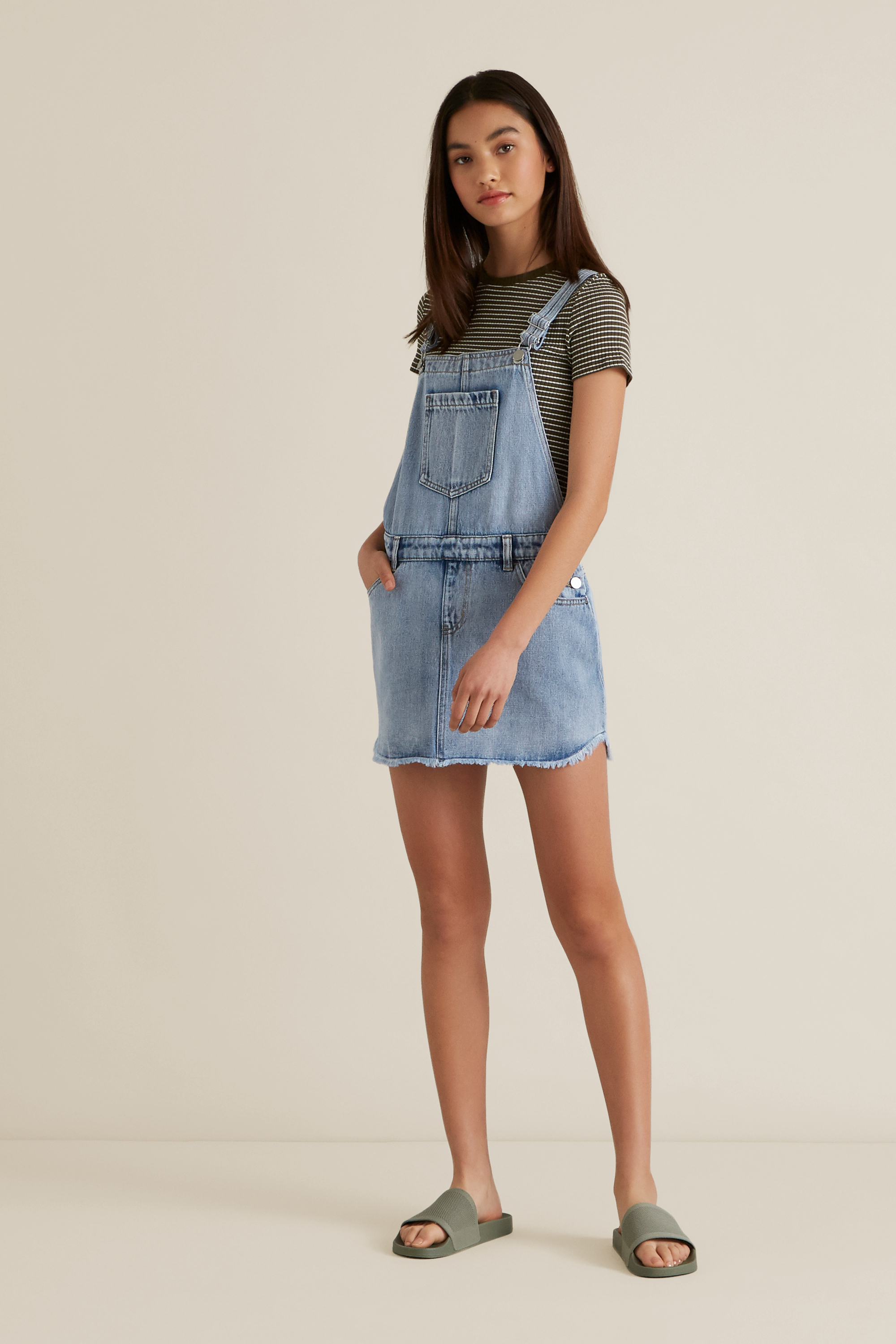 Crafted from a rigid twill, this Distressed Denim Pinafore is a preppy-look wardrobe staple. Featuring matte silver hardware, it is detailed with shoulder straps, square neckline, functional pockets and a heavy washed skirt. Made from a Polyester/Viscose/Cotton blend, it is available in sizes 8 to 16. For your reference, our model is 173cm and wears a size 14. Check the label inside of the garment for care information.