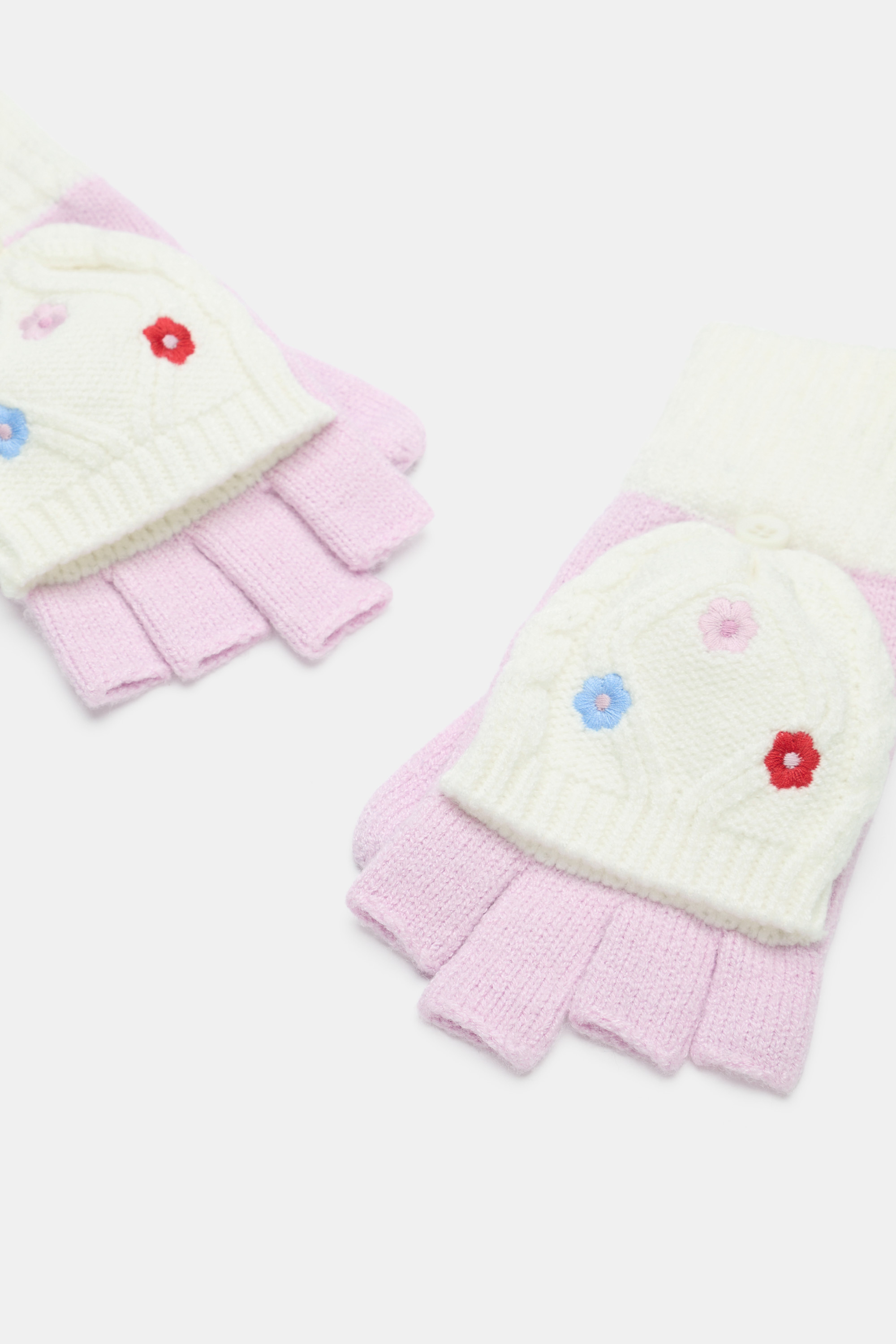 Add some sweetness to wintry days with this adorable set of convertible mittens, complete with a cable design and embroidered flowers. Pair with the matching beanie and poncho for the sweetest cool-weather set.