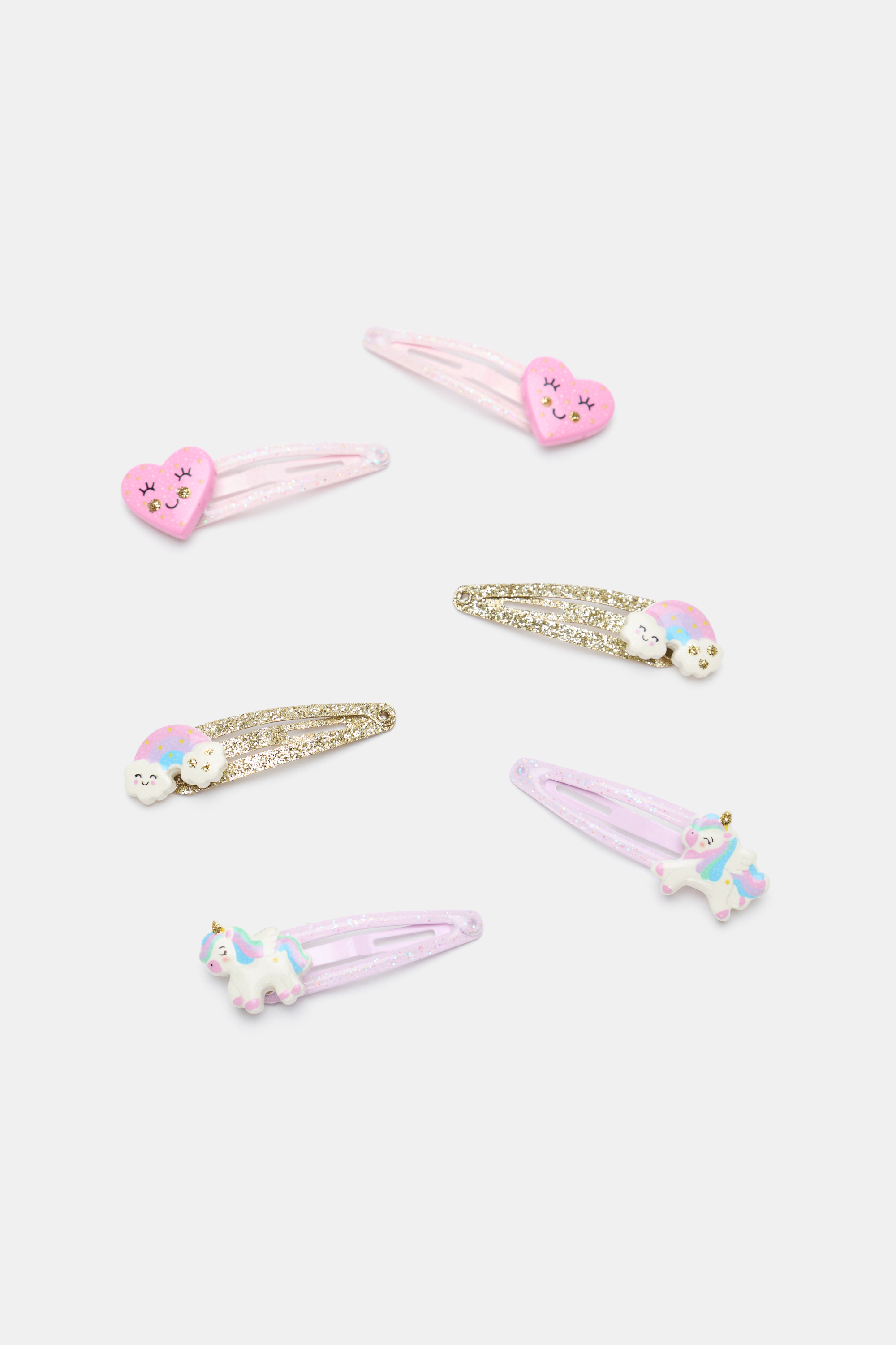 This set of glittery hair snaps features the most magical designs including rainbows, hearts and unicorns. This product is not a toy and is not suitable for children three years and under.