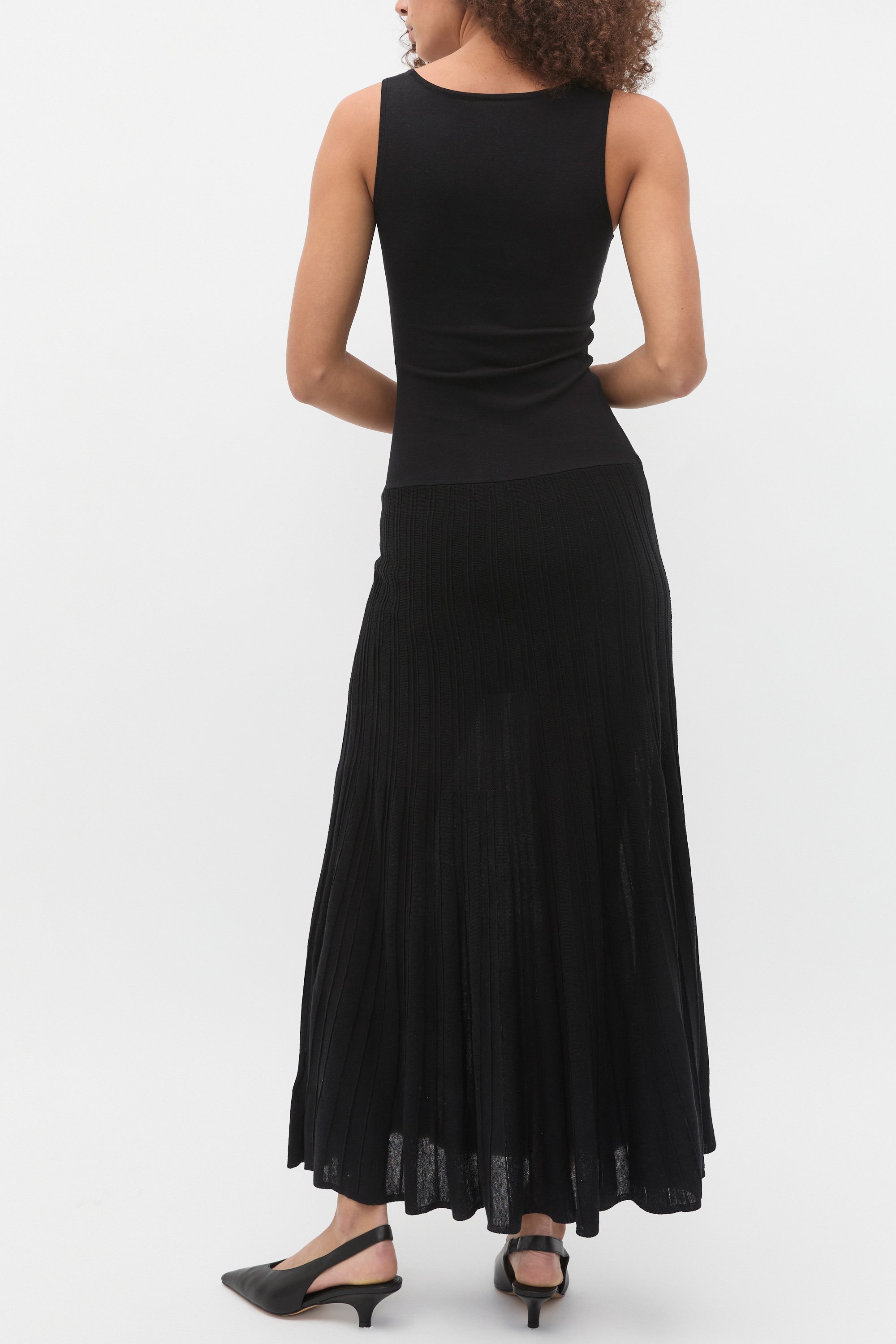 Sleek and elevated, this dress offers comfortable sophistication to your evening looks. Finished in a rib knit, it's a sleeveless design and features a scoop neck, a neat fit stretch fit through the body and falls to a maxi length with a sheer detail. It has a slip that falls to a mini length.
