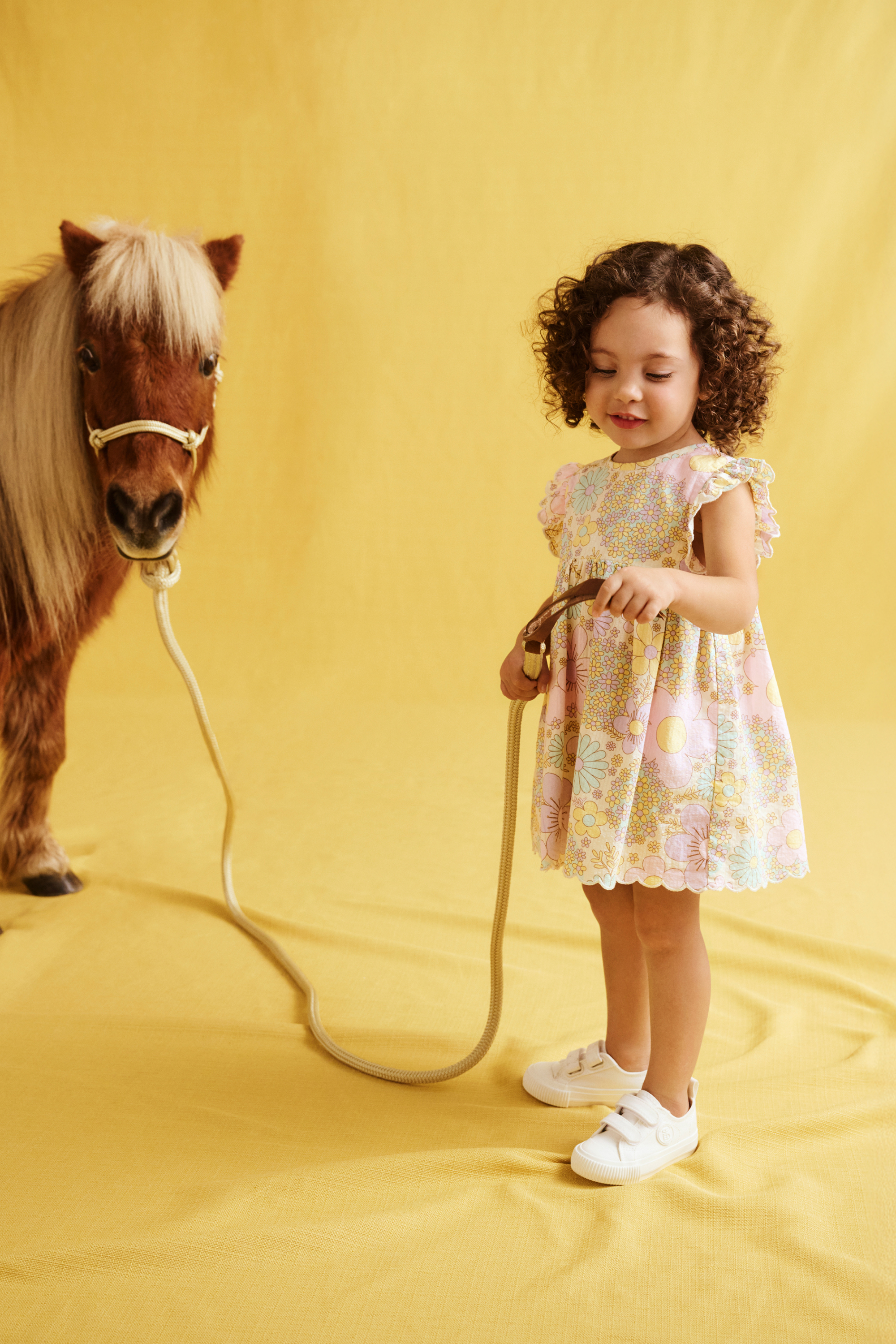 Dress her up in our new sun-soaked print with this adorable little dress. Crafted in premium cotton, it's lightweight and loose-fitting featuring a round neck and ruffle trims at the shoulder. Secures with buttons at the back.
