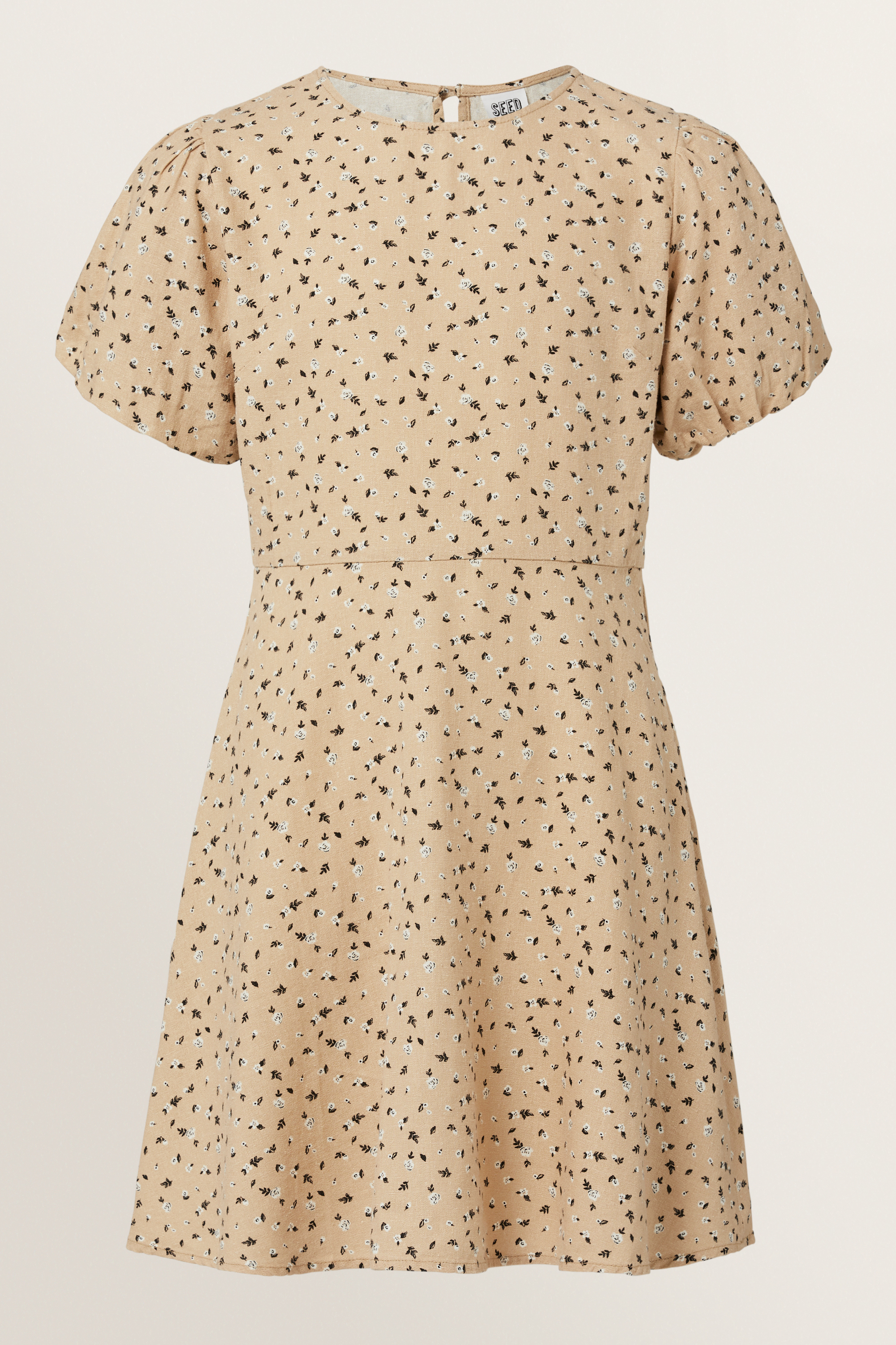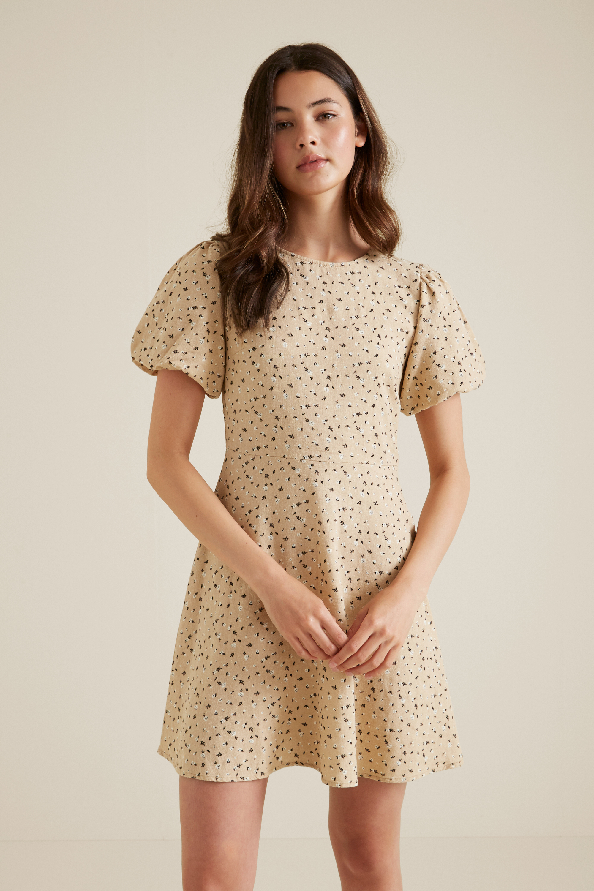 Designed with a beautiful blossom yardage print, this Floral Dress is crafted from a breathable linen/viscose blend, detailed with a round neckline, puff sleeves and flared skirt.