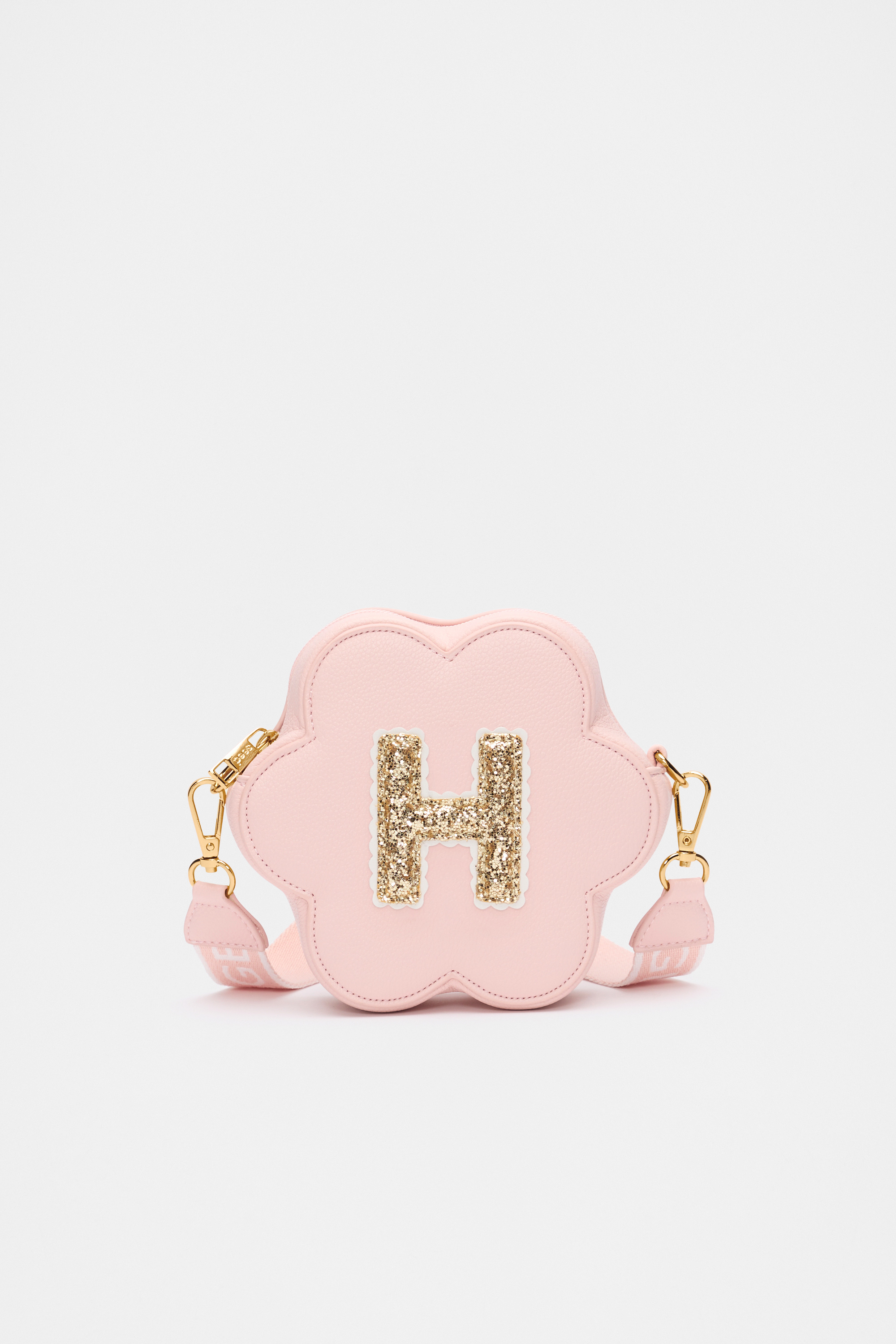 Stylish, fun, and personalised, this flower-shaped bag features a detachable crossbody strap with logo details, a top zip closure, gold-look hardware, and a glitter initial on the front. It also has a flower charm on the strap.