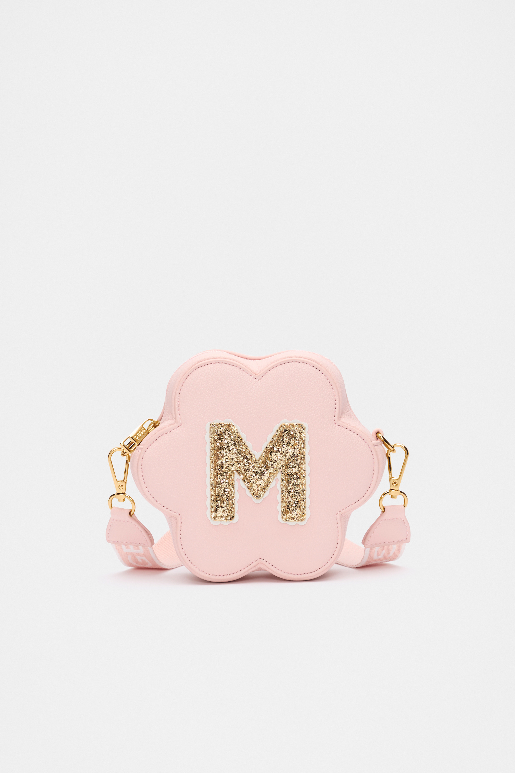 Stylish, fun, and personalised, this flower-shaped bag features a detachable crossbody strap with logo details, a top zip closure, gold-look hardware, and a glitter initial on the front. It also has a flower charm on the strap.