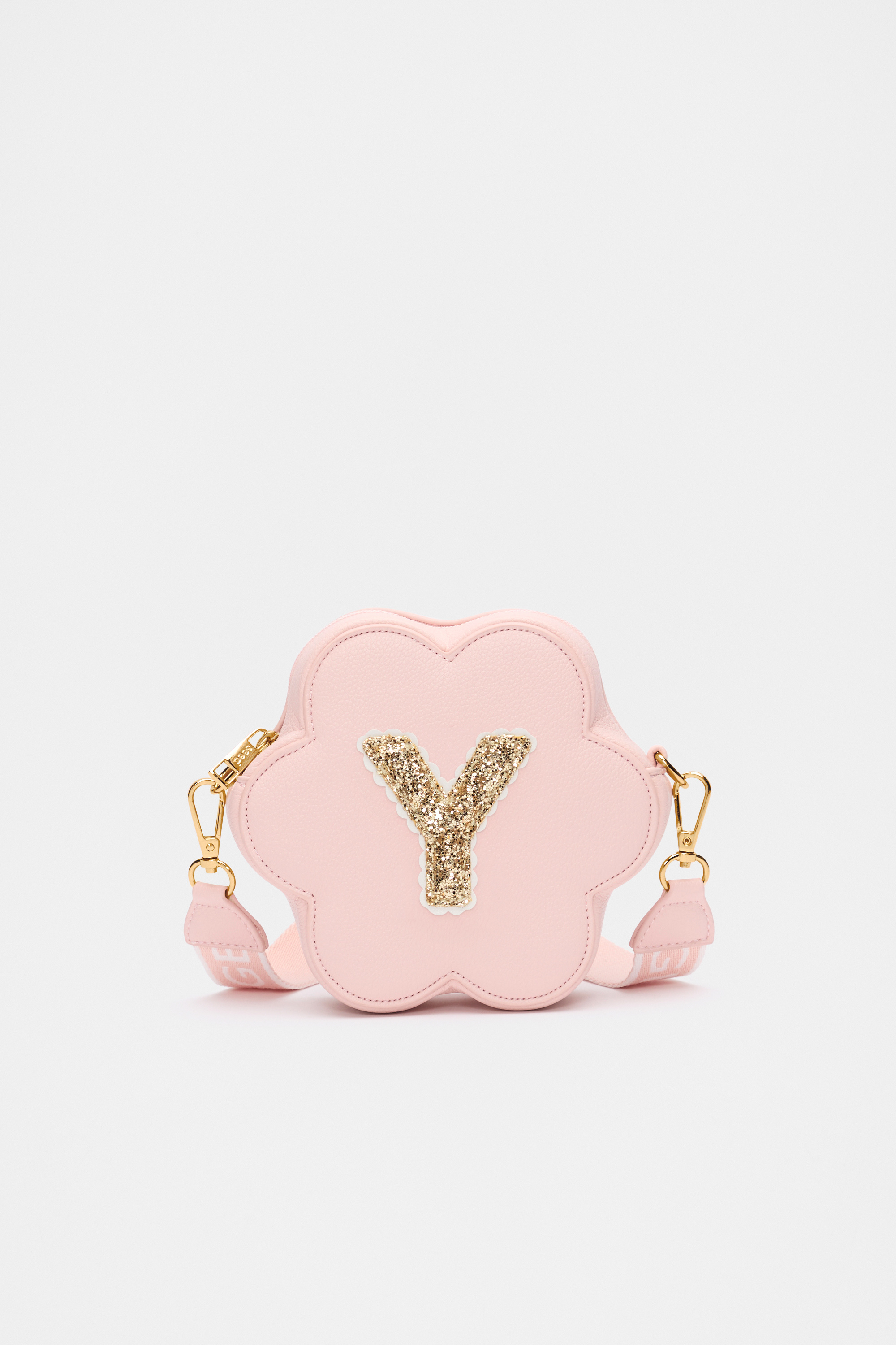 Stylish, fun, and personalised, this flower-shaped bag features a detachable crossbody strap with logo details, a top zip closure, gold-look hardware, and a glitter initial on the front. It also has a flower charm on the strap.