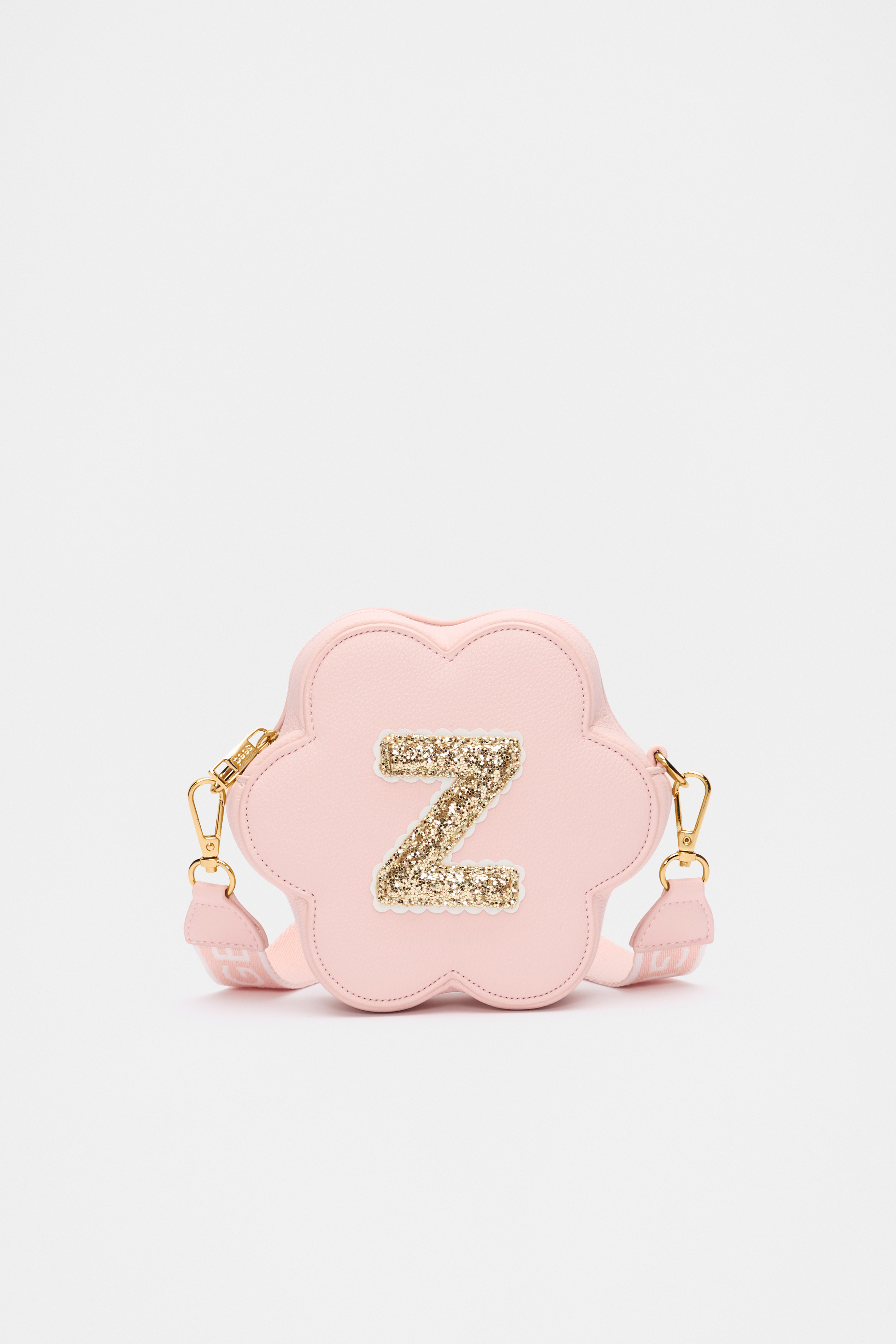 Stylish, fun, and personalised, this flower-shaped bag features a detachable crossbody strap with logo details, a top zip closure, gold-look hardware, and a glitter initial on the front. It also has a flower charm on the strap.