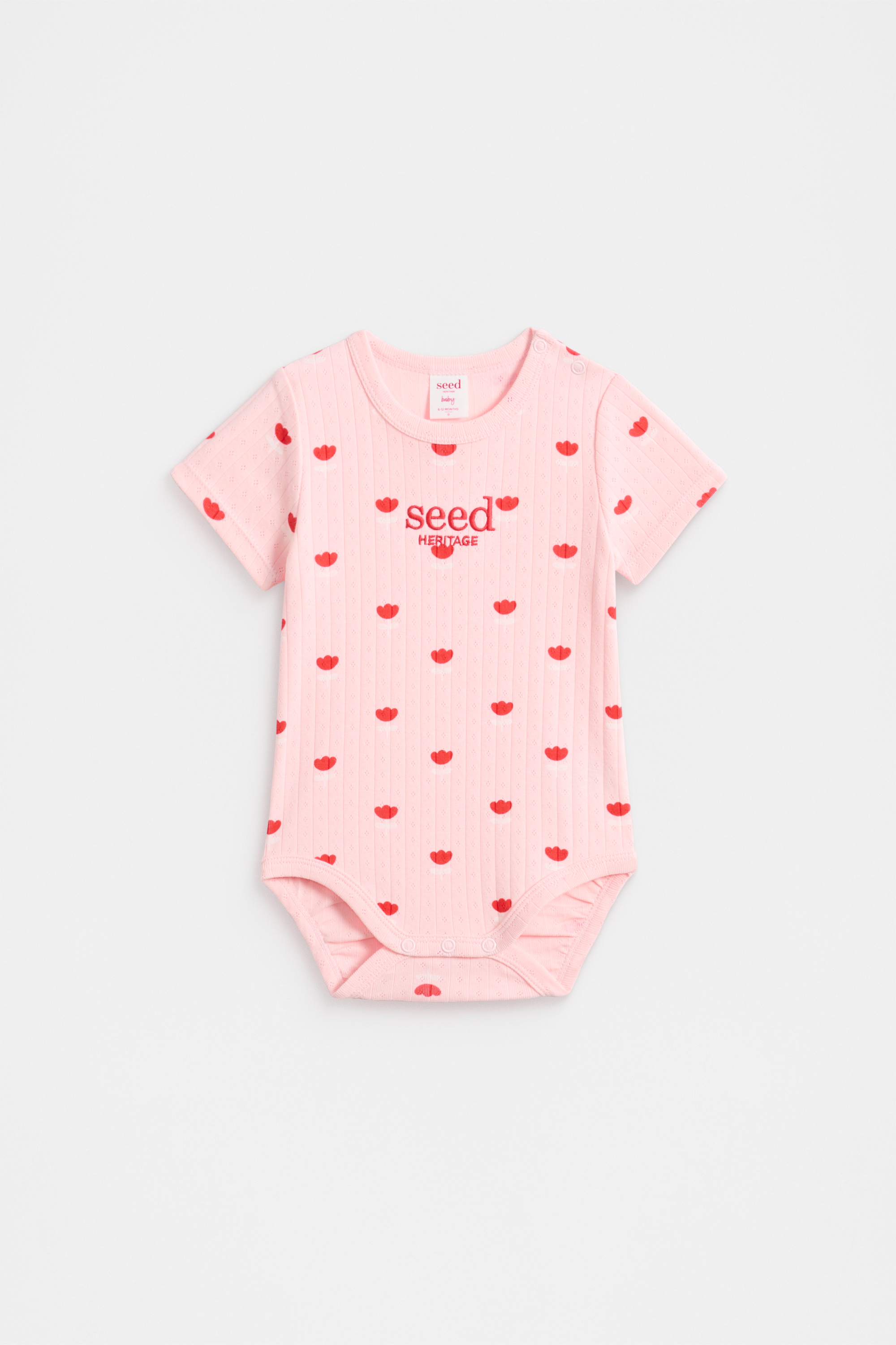 Made from an ultra-soft cotton pointelle with the perfect amount of stretch, this bodysuit is the sweetest style for any newborn. It's a short-sleeved style with a round neck, an all-over flower pattern, and an embroidered Seed Heritage logo. It fastens with snaps at the shoulder and gusset for quick and easy changes.