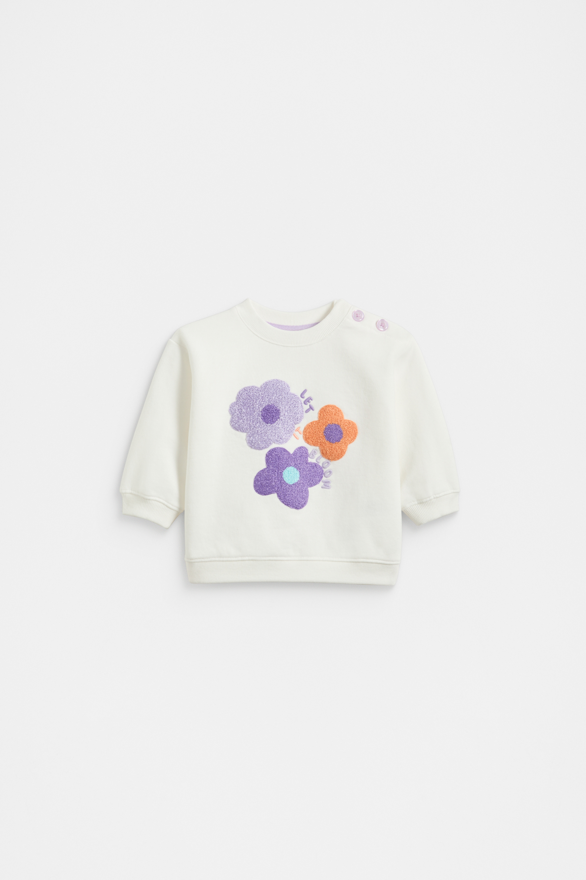 Detailed with adorable chenille patch flowers, this little jumper is sure to become a new favourite in her wardrobe. Crafted in premium cotton, it's soft to the touch and features a round neck, long sleeves and ribbed detailing at the cuffs and trim.