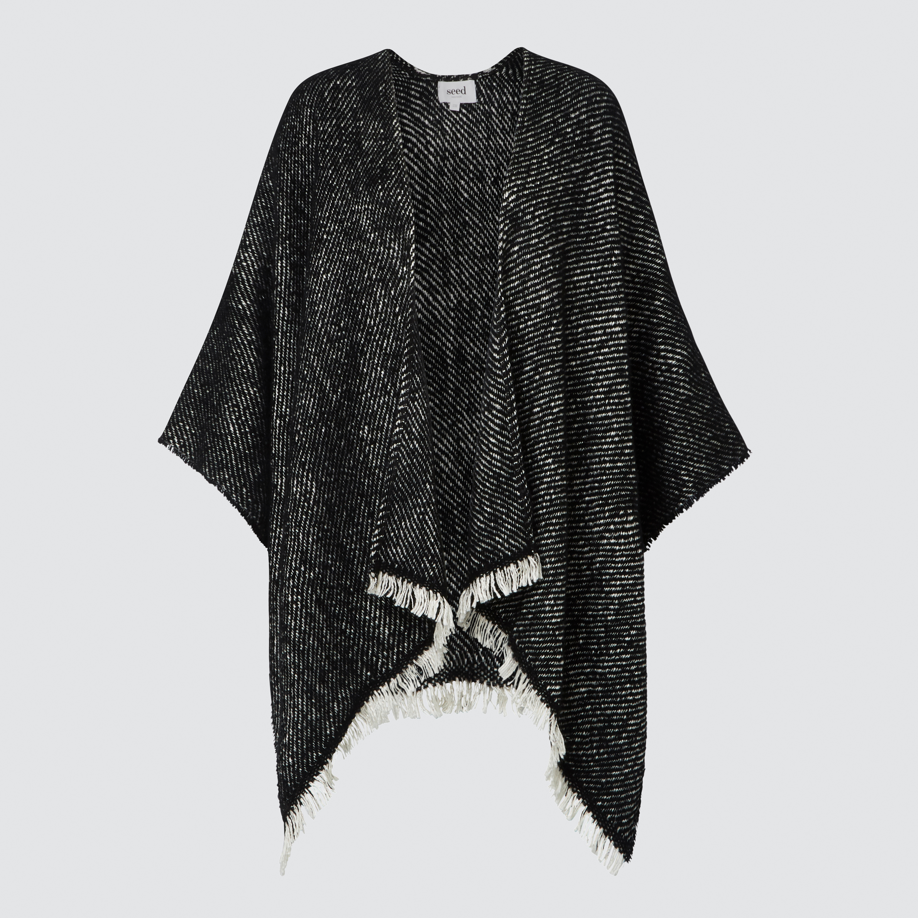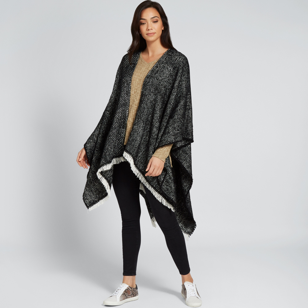 This poncho features a black and white textured design and a fringe edge. Made from acrylic, this poncho is available in Black Marle and in one size. Please wash as per care instructions found on garment.