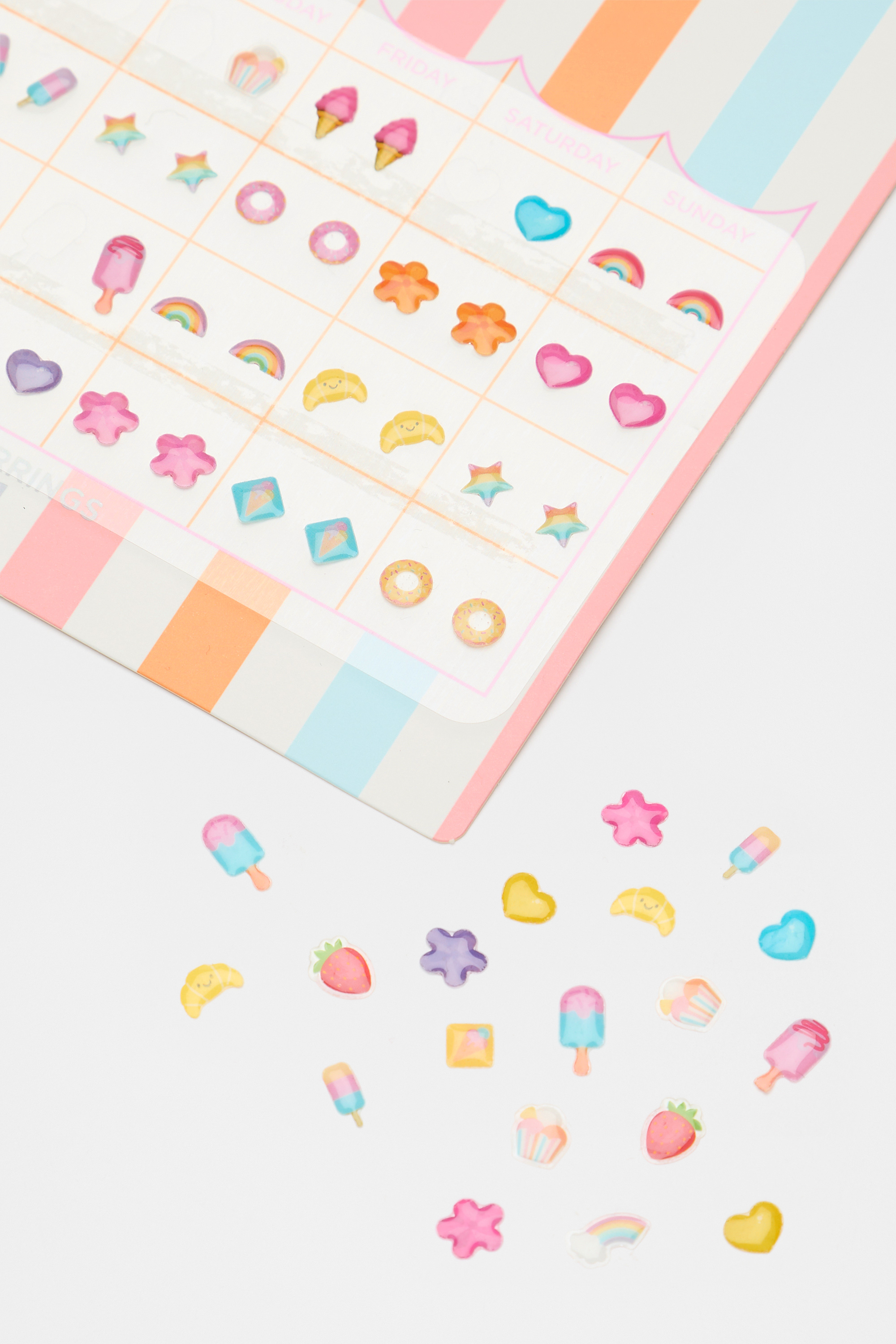 Perfect for unpierced ears, these stick on earrings feature multicoloured designs of gelato, stars, hearts and more. This product is not a toy and is not suitable for children three years and under.