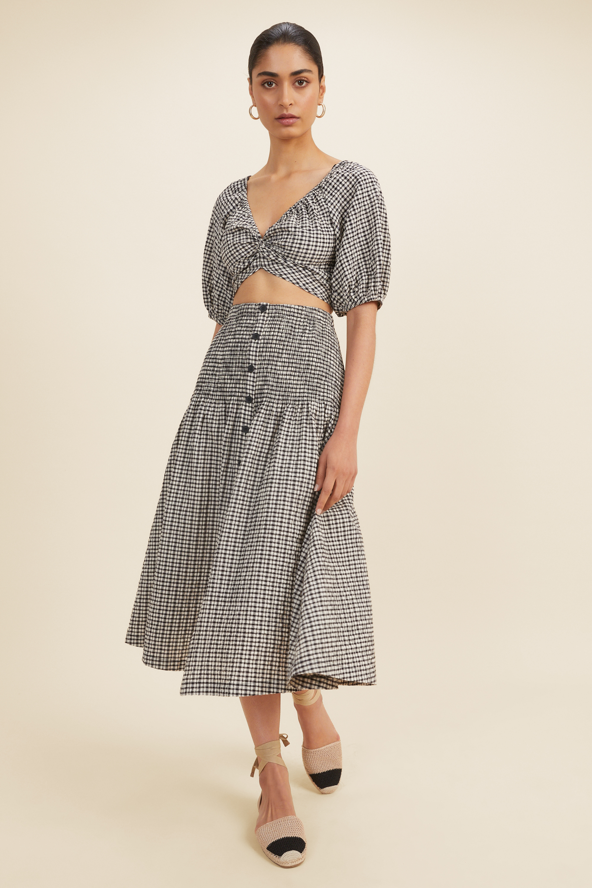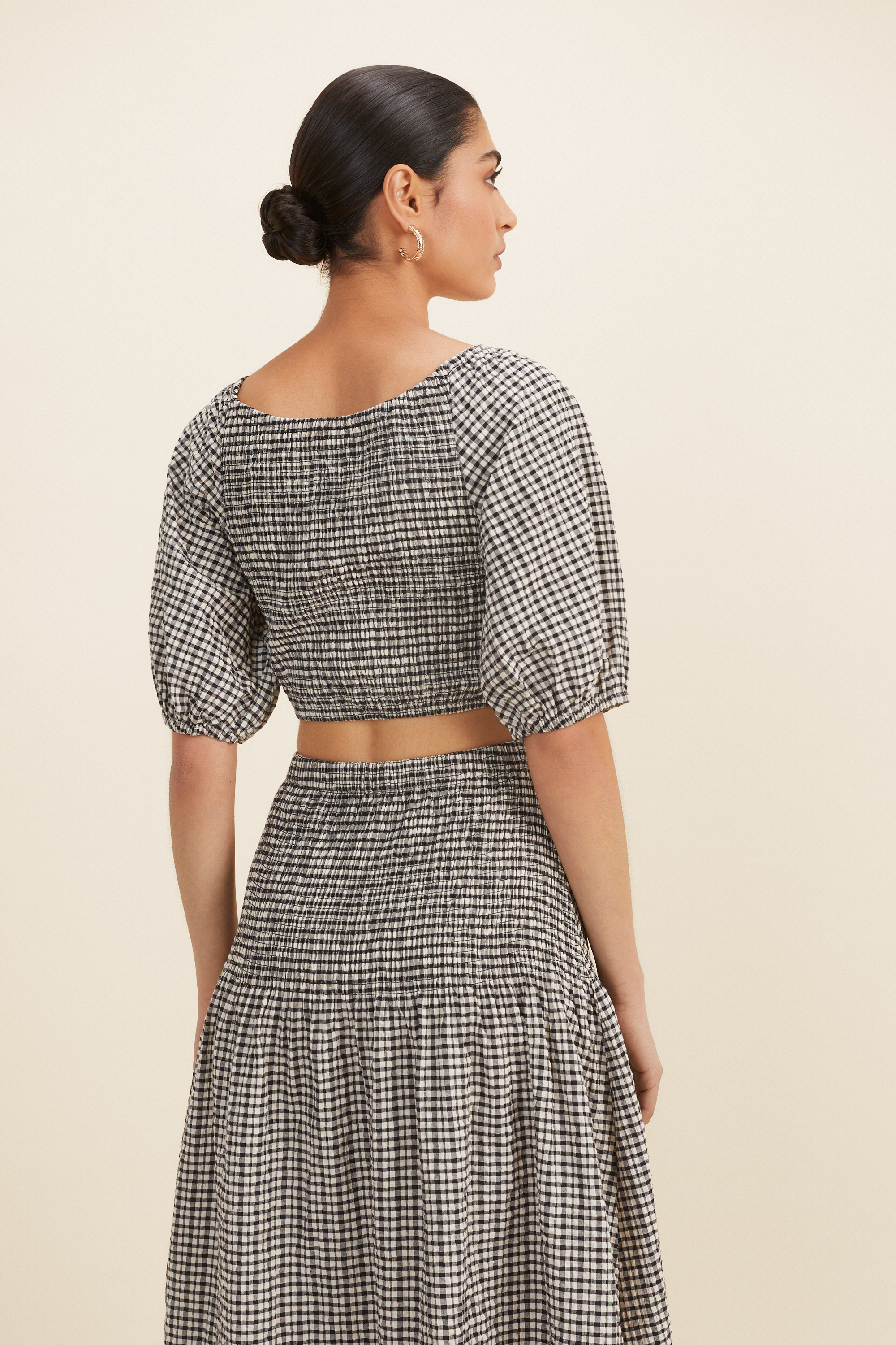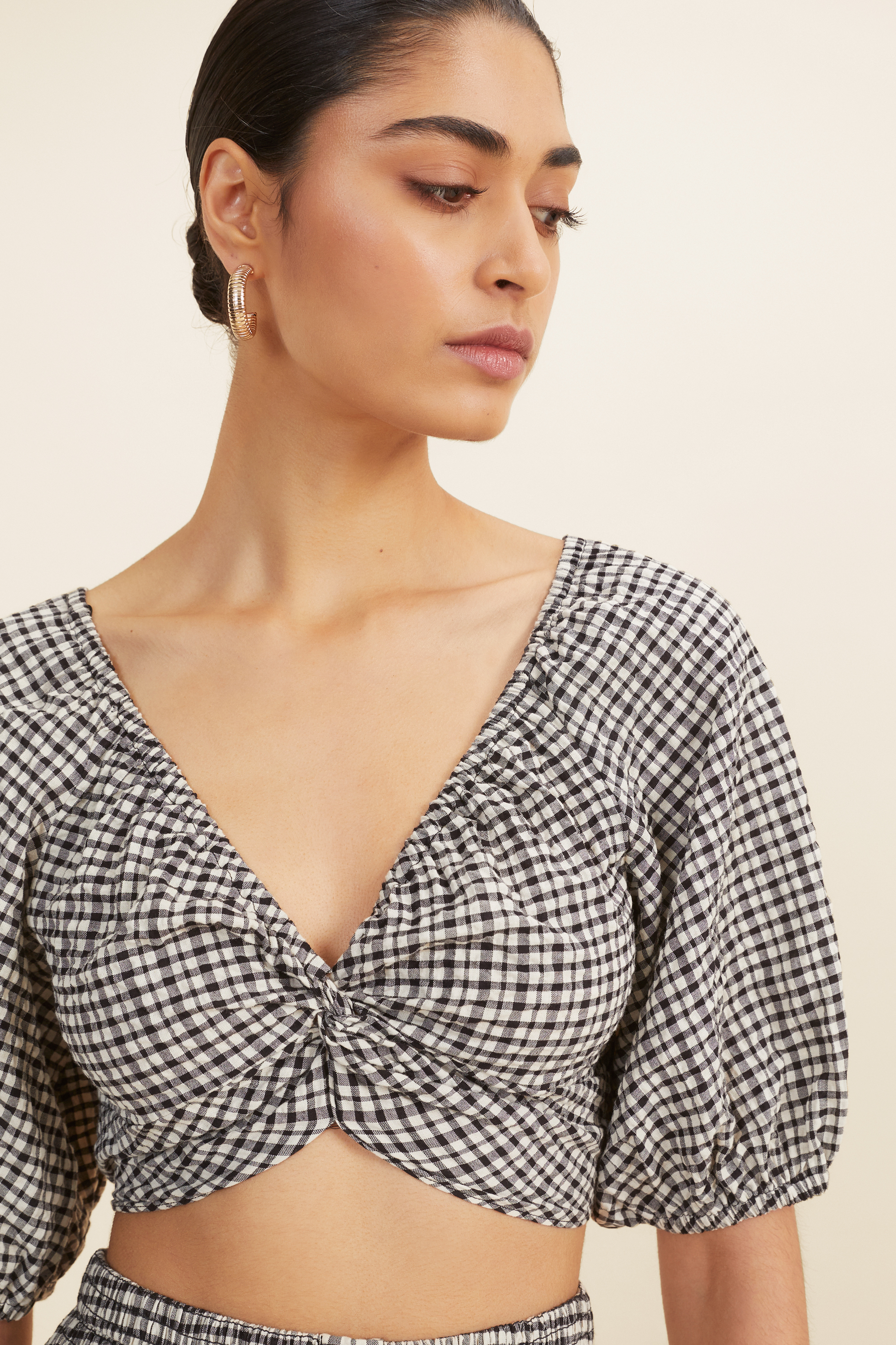 This twist front crop will instantly elevate any outfit, all-year round. The plunging V neckline is contrasted by the puff sleeves, and the textured material twists at the front to create a flattering silhouette. Printed all over with a gingham pattern, the cotton blend top has elastic at the cuffs and a shirred back for a comfortable fit.