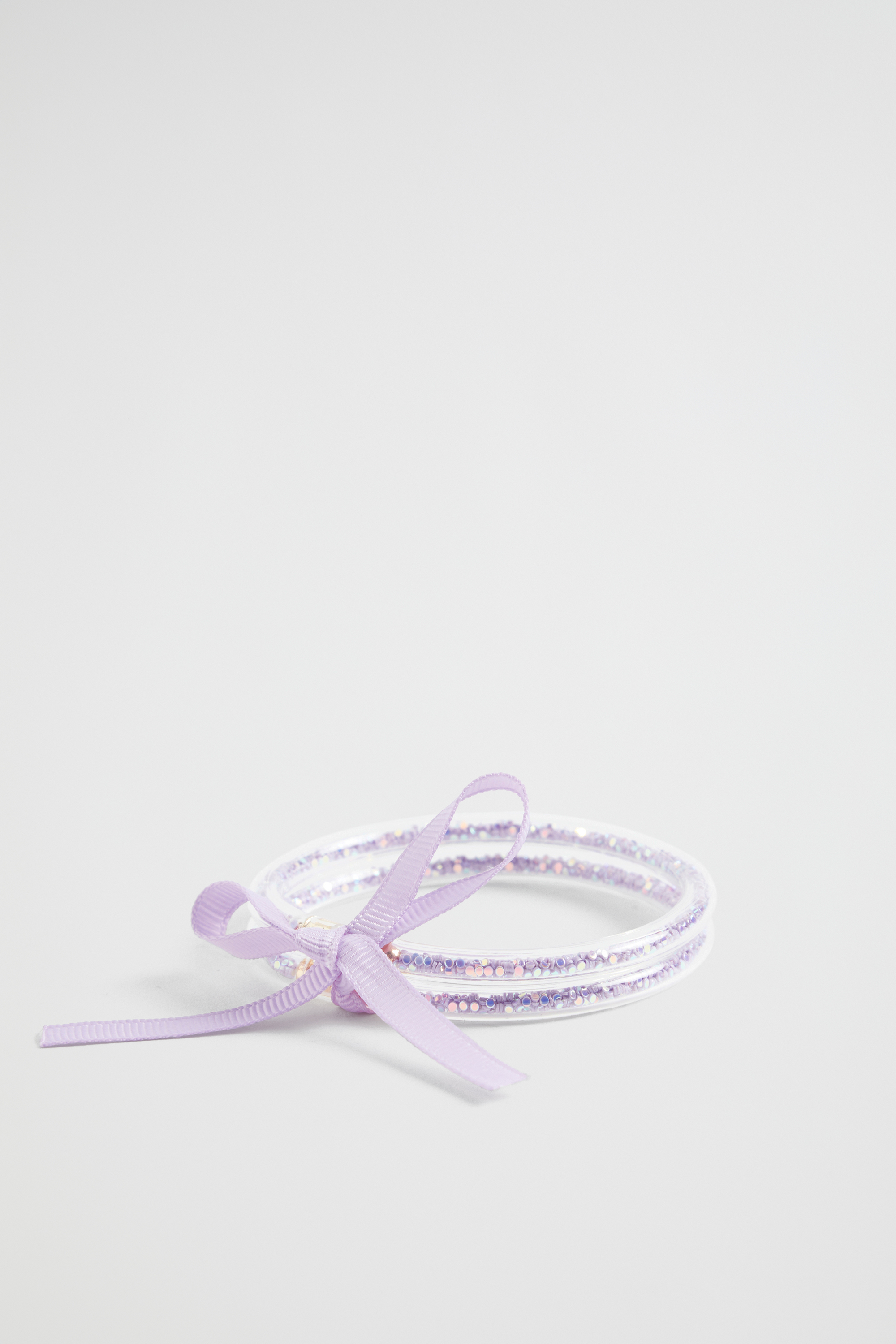 Add a touch of sparkling fun to any outfit with these glitter bangles, featuring a grosgrain ribbon tie and a gold-look detail. They come in a handy set of two. This product is not a toy and is not suitable for children three years and under.