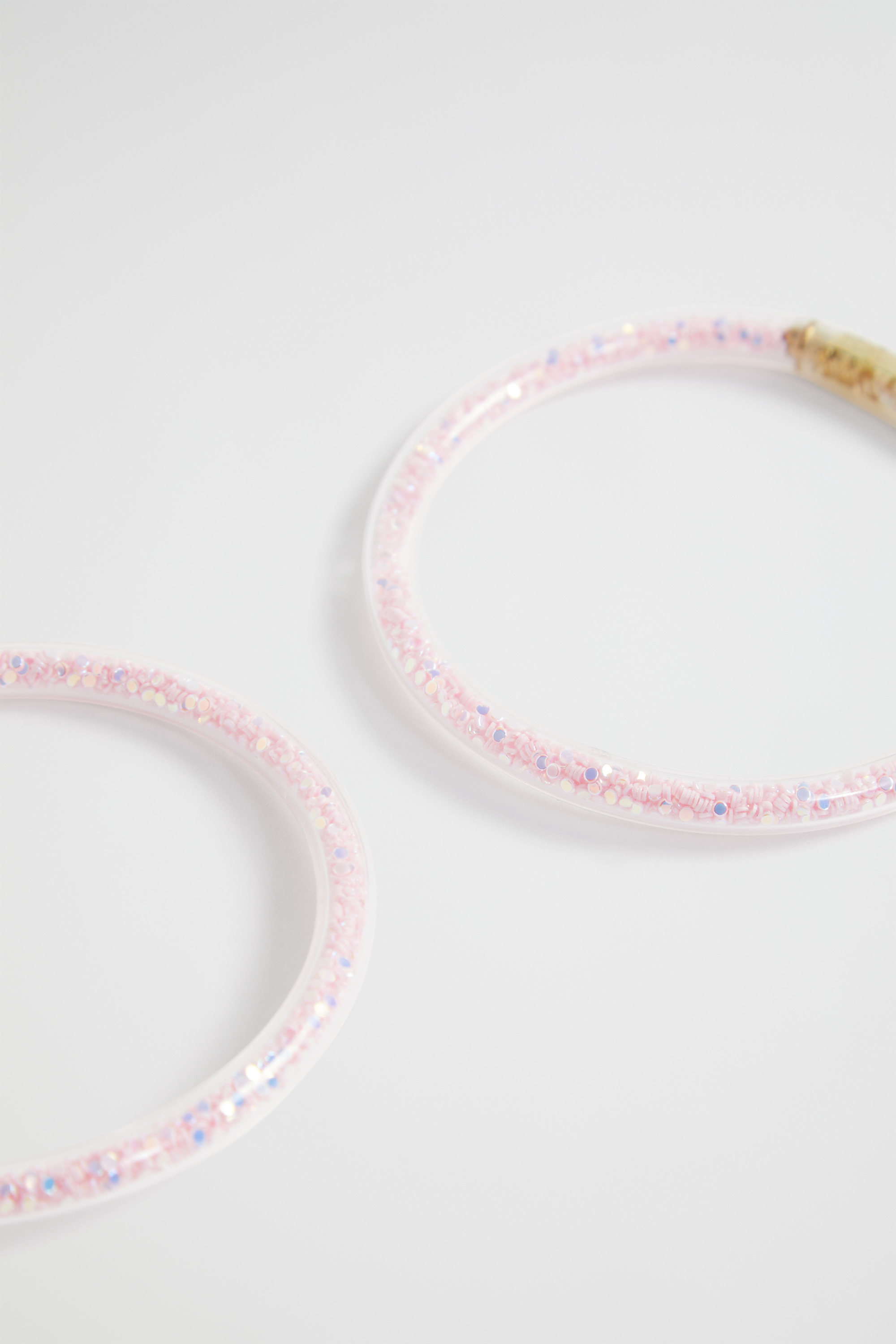 Add a touch of sparkling fun to any outfit with these glitter bangles, featuring a grosgrain ribbon tie and a gold-look detail. They come in a handy set of two. This product is not a toy and is not suitable for children three years and under.