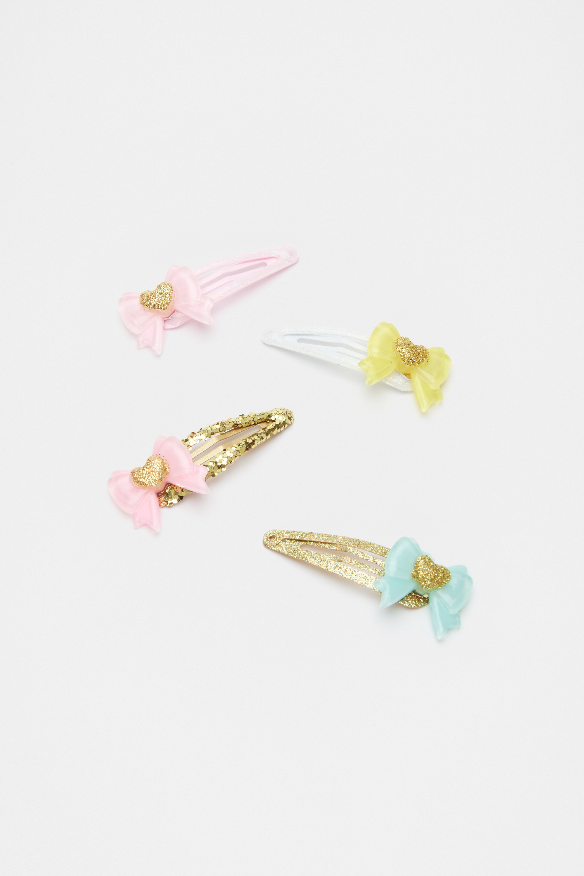 Sparkly and bright, this set of clips features bows with hearts to add some charm to her look. This product is not a toy and is not suitable for children three years and under.