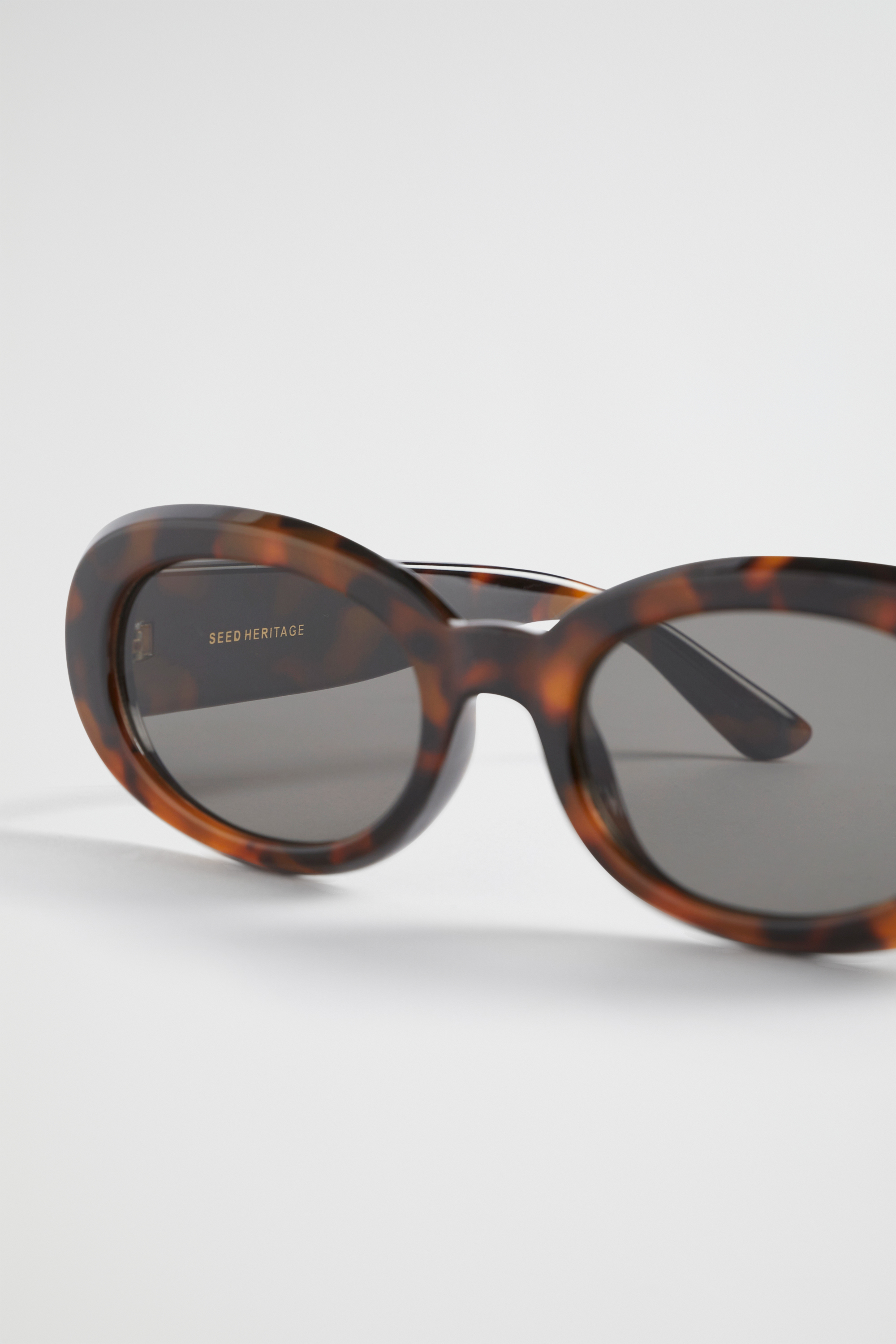 These sunglasses have a slim oval shape, with a modern, flat profile. Lens cloth and pouch included.