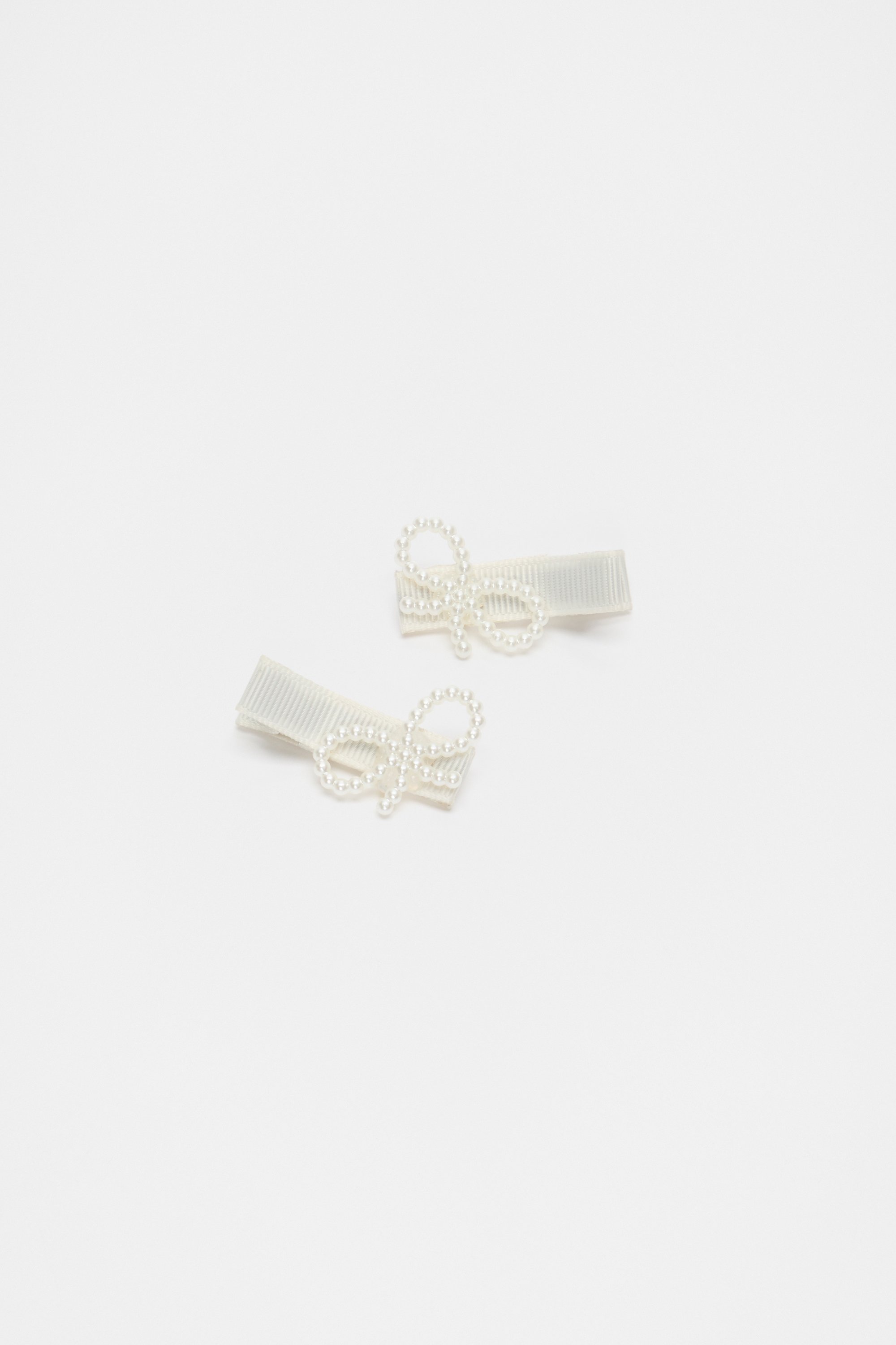 This duo of hair clips adds a touch of sweetness. Each clip features a bow of pearls on a grosgrain ribbon duck clip. This product is not a toy and is not suitable for children three years and under.