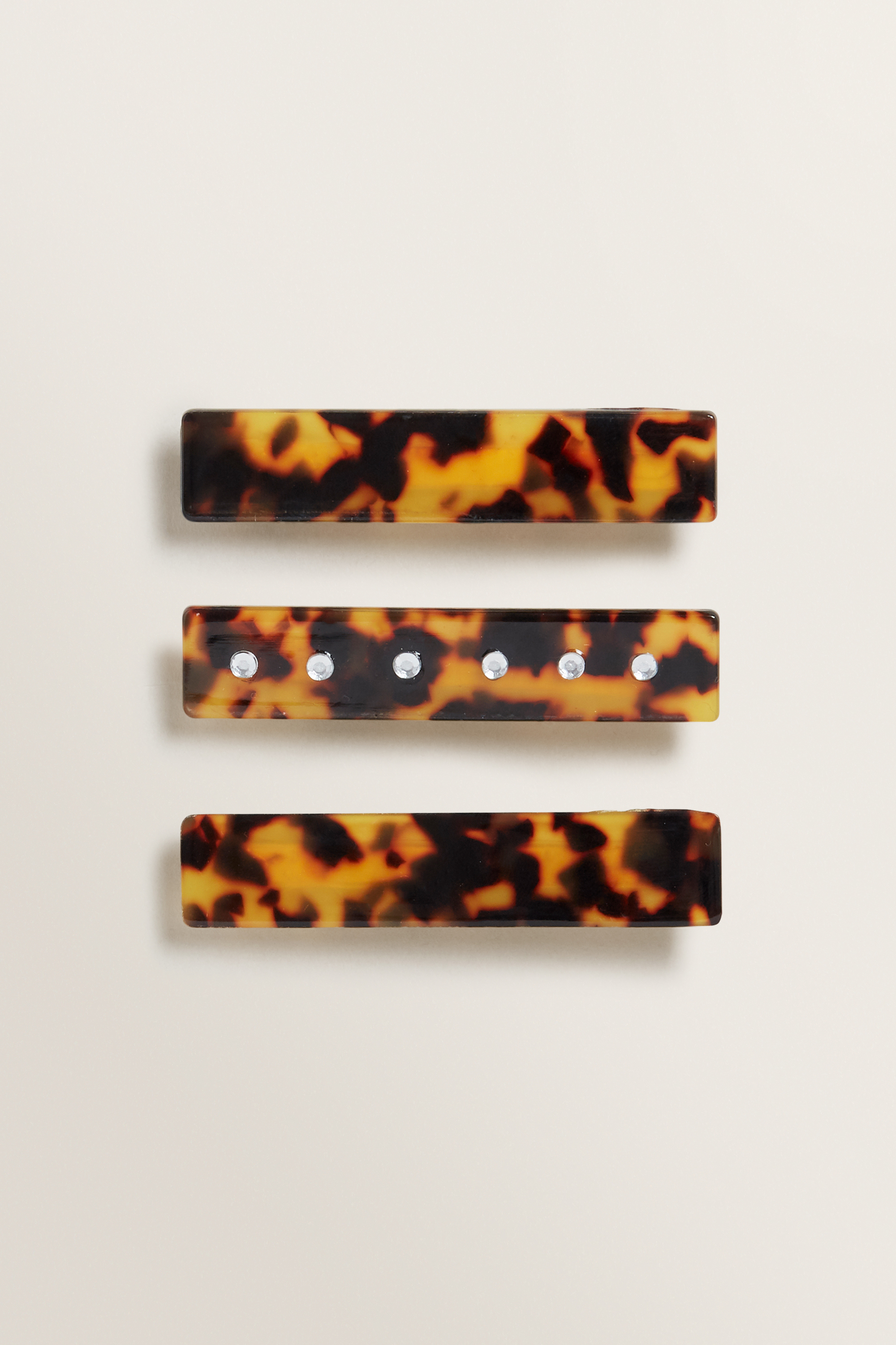 Coated in a tortoiseshell resin, this Hair Slide Three Pack is a seasonal staple accessory. This statement piece is made from a metal base slider, encased in a resin with subtle diamante details. Available in one size, This Hair Slide Three Pack is designed to be worn as a set.