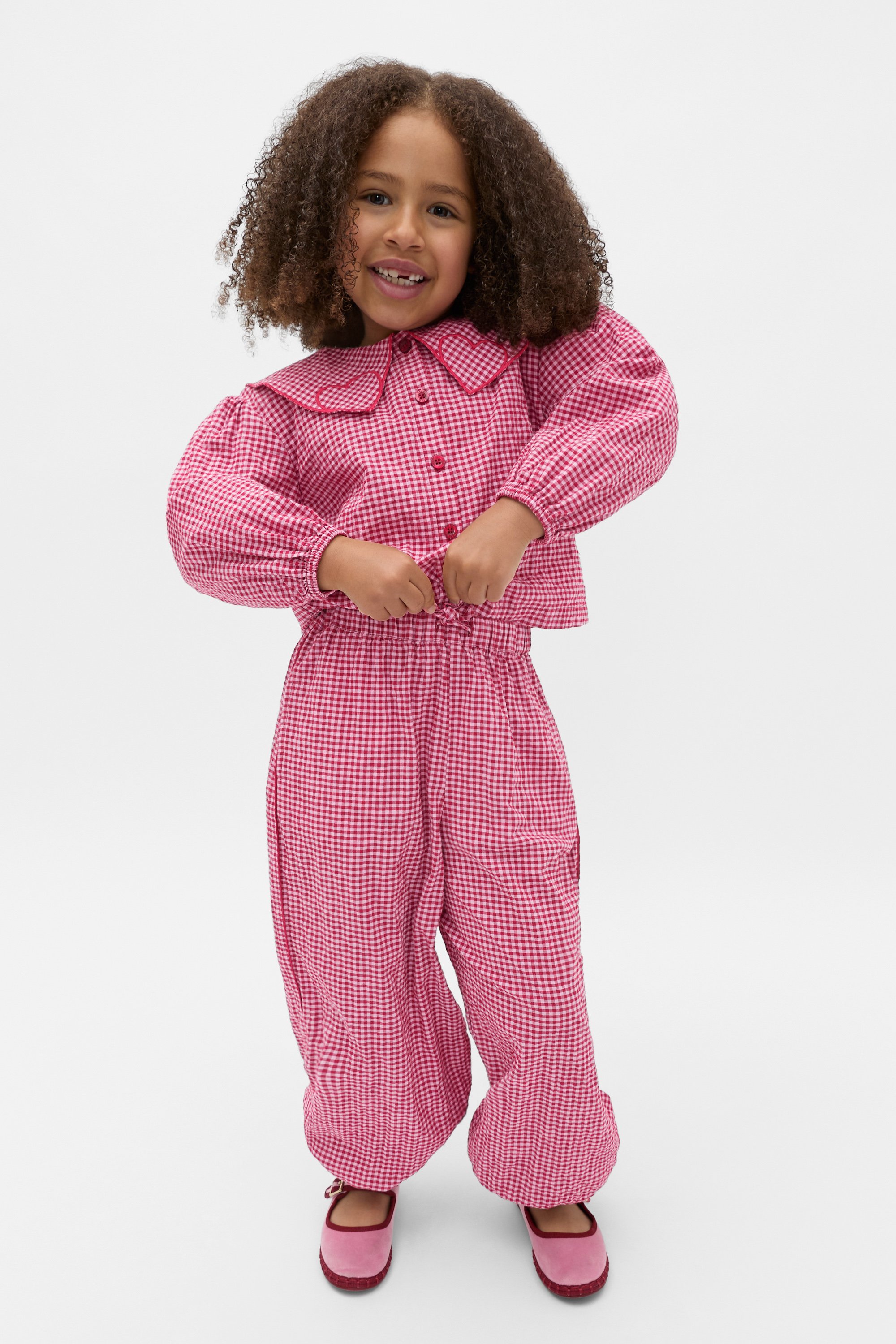 Sweetly finished in gingham, this shirt is perfect for dressier occasions and birthday parties. Crafted in premium cotton, it features a statement collar with heart embroidery, long sleeves with elasticated cuffs, a button-through front and a relaxed fit through the body. Style with the matching gingham pants for the cutest coordinated set.