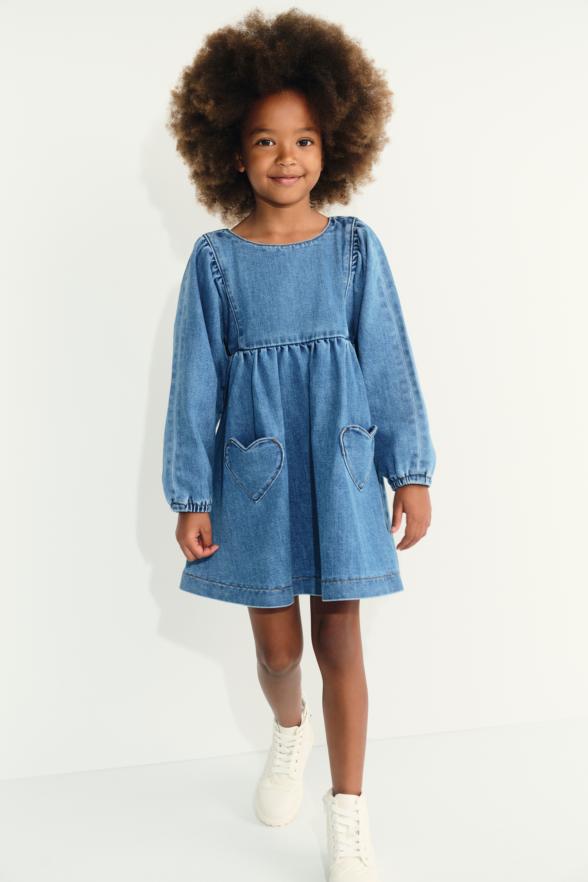 Style her in sweetness with this denim dress, finished with adorable heart-shaped pockets. Crafted in premium cotton, it's a medium weight denim and features long sleeves with elasticated cuffs and secures with a zip at the back.