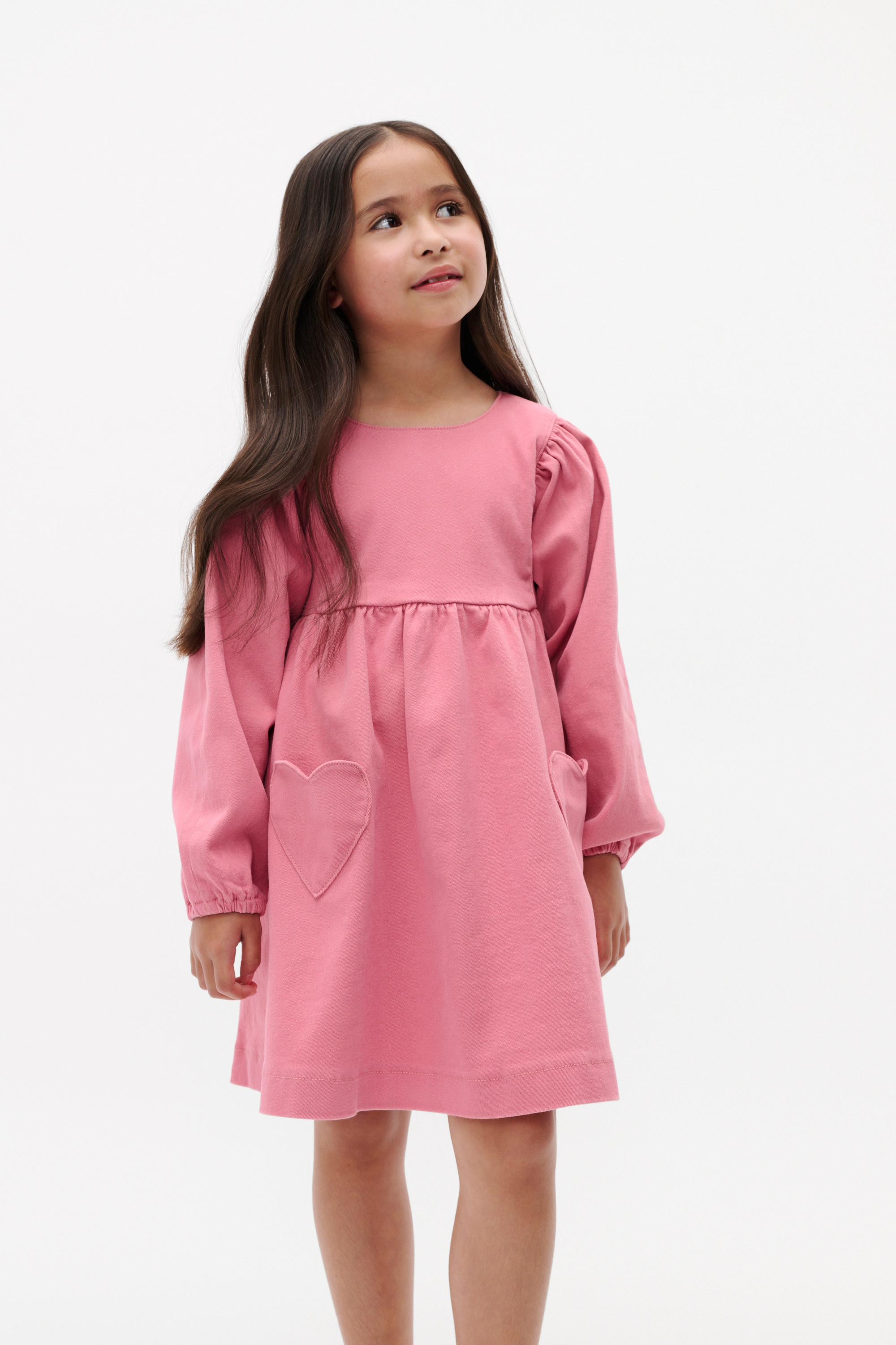 Style her in sweetness with this denim dress, finished with adorable heart-shaped pockets. Crafted in premium cotton, it's a medium weight denim and features long sleeves with elasticated cuffs and secures with a zip at the back.