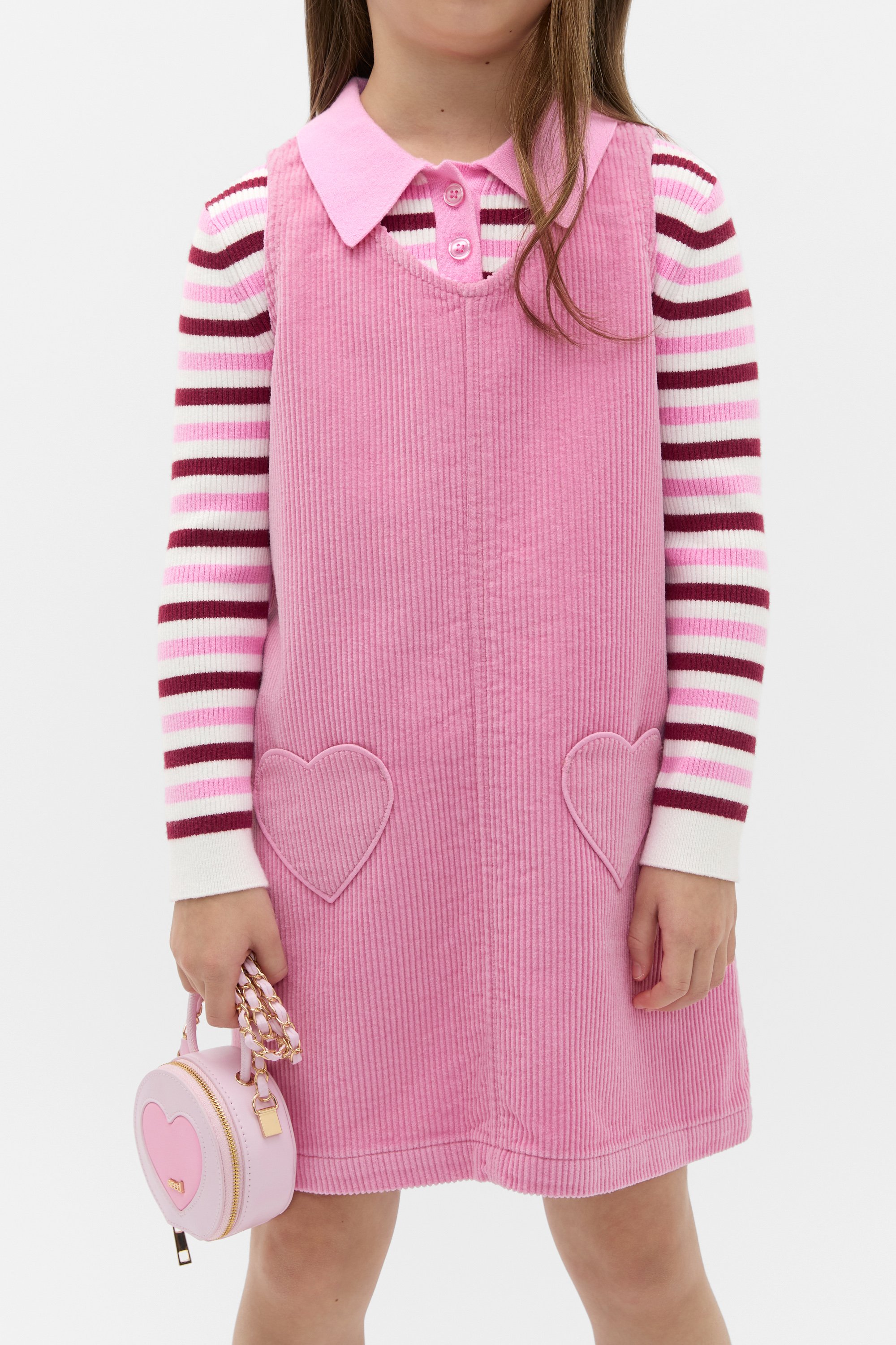 Pretty in pink with the sweetest heart design, this pinafore is the perfect style to layer through the in-between seasons. Crafted in premium cotton and finished in a soft cord, it's a sleeveless style and features a V neck and two heart-shaped pockets.