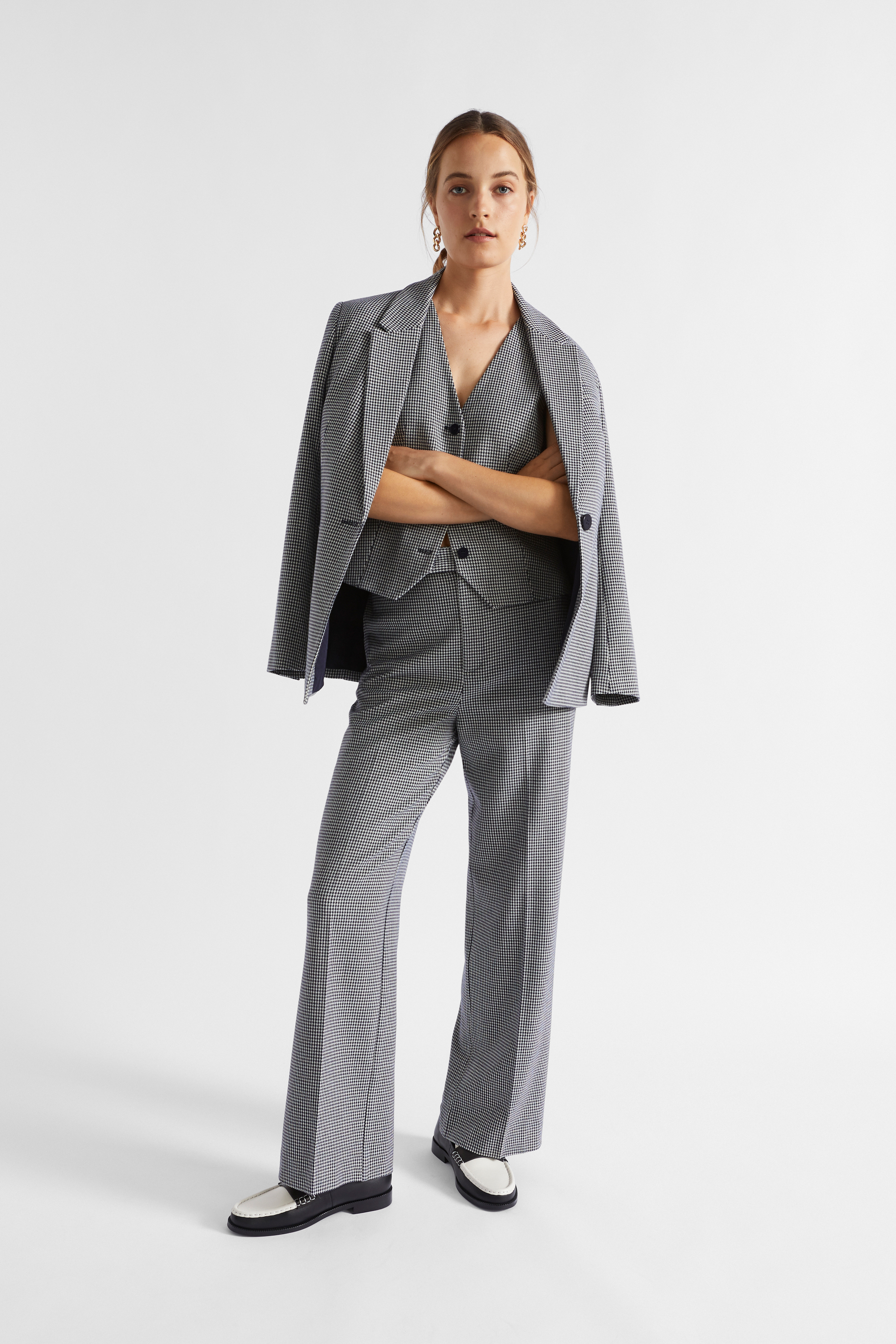 In a timeless houndstooth pattern, these trousers are an essential piece for the cooler months. They feature a high waist and a wide leg shape, pairing perfectly with the rest of our suiting edit.