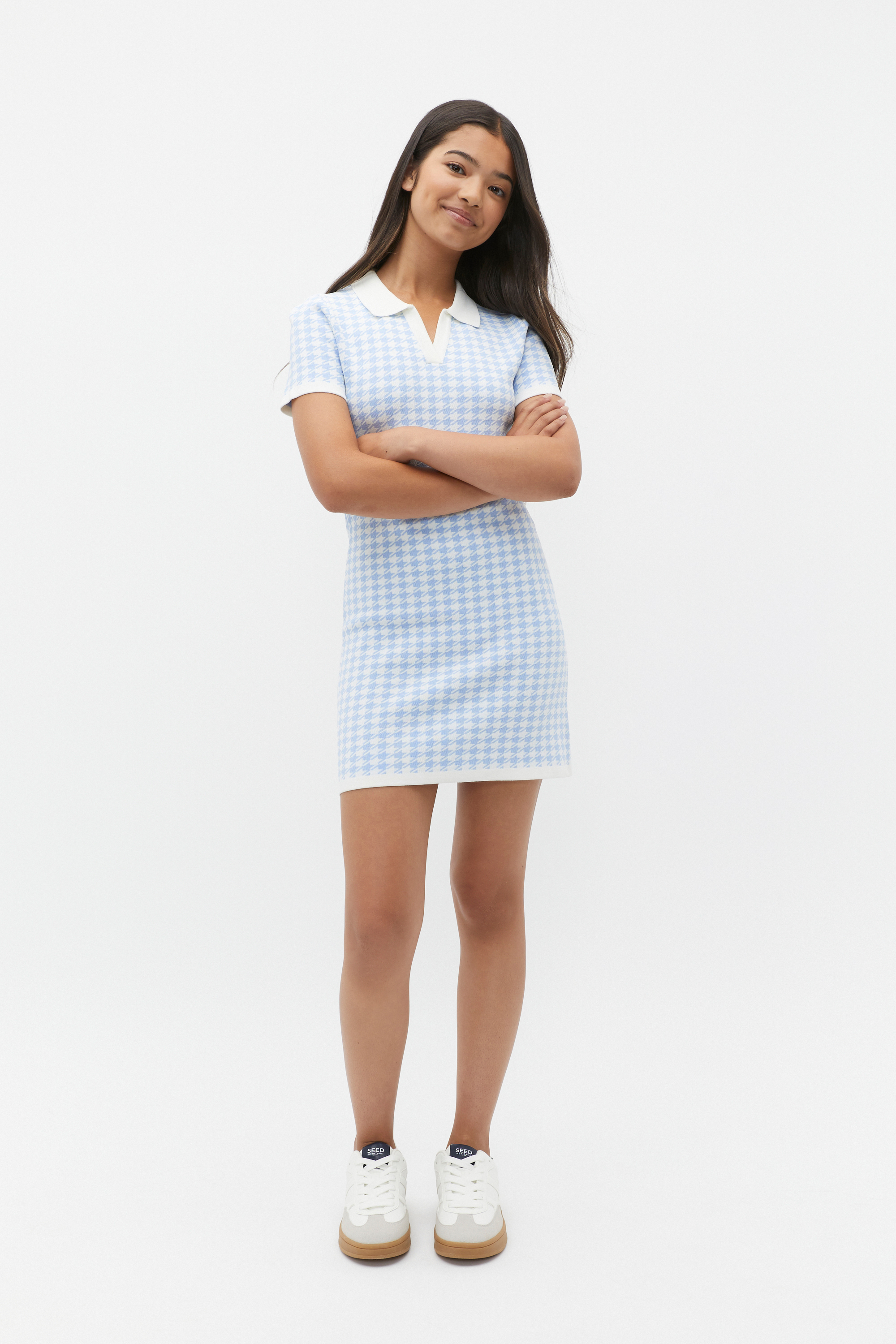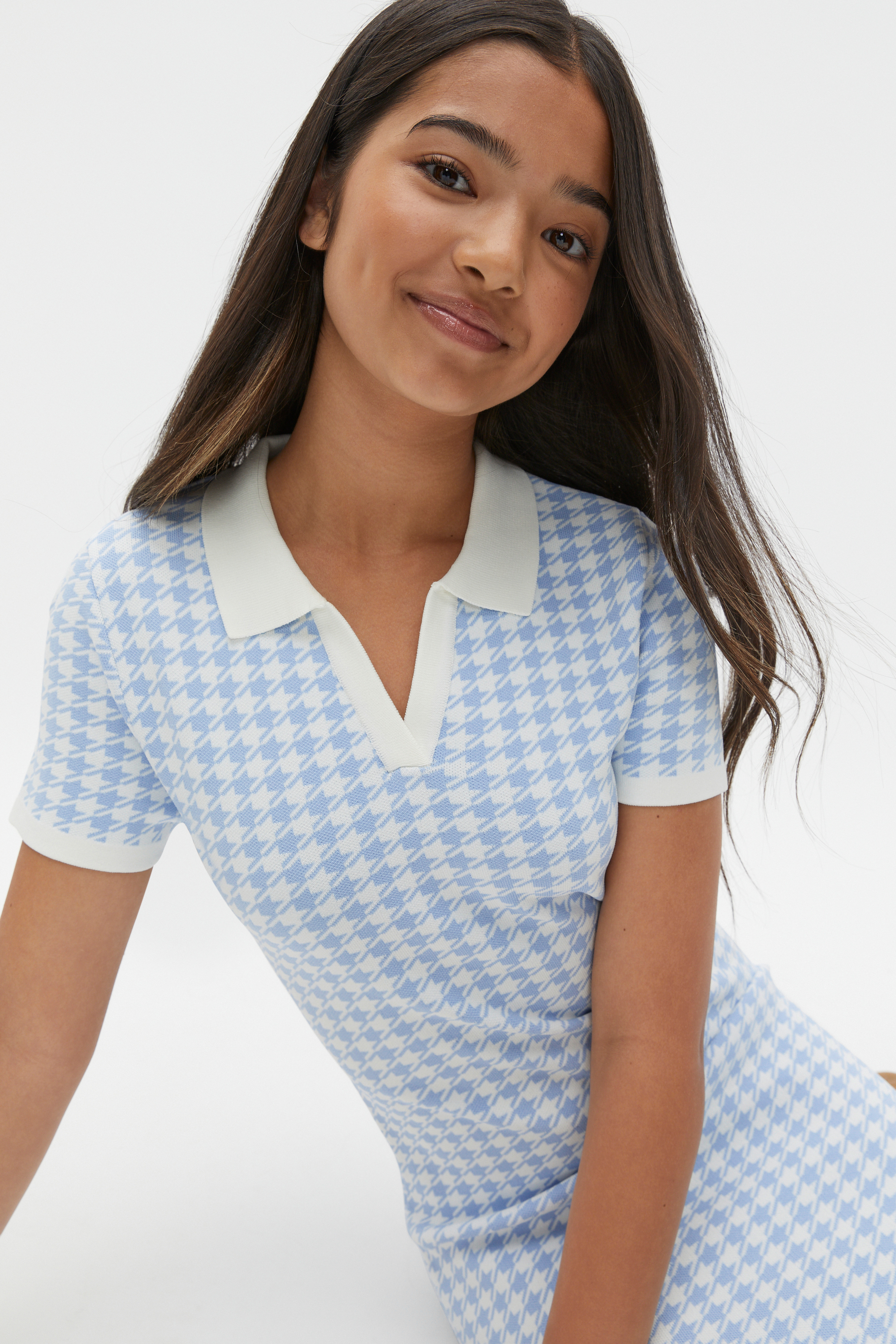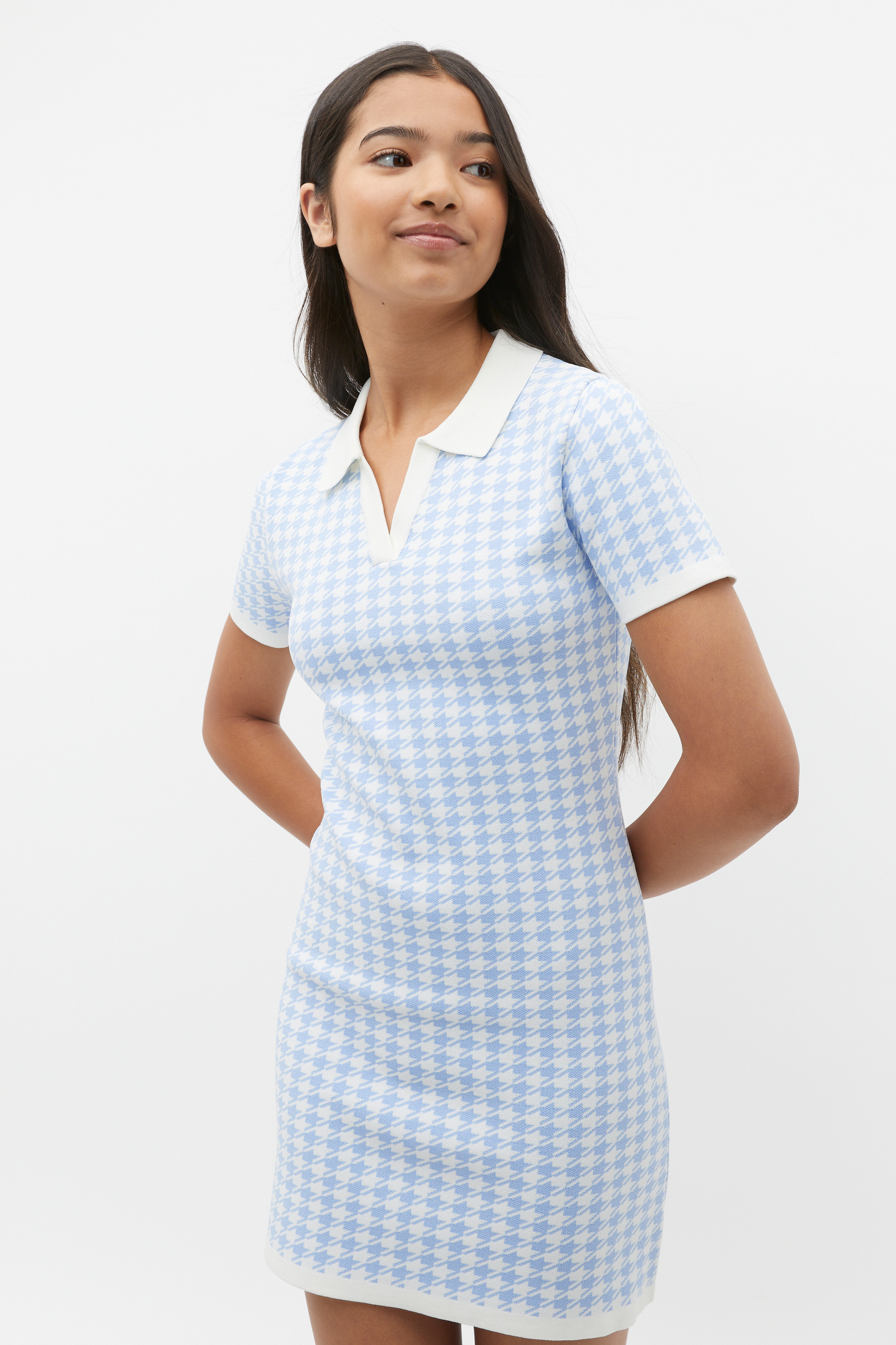 Sophisticated and chic, this dress is an effortless head-to-toe style. It features an open collar, short sleeves and a mini length finished with an all-over houndstooth print. It has a soft ribbed knit finish.