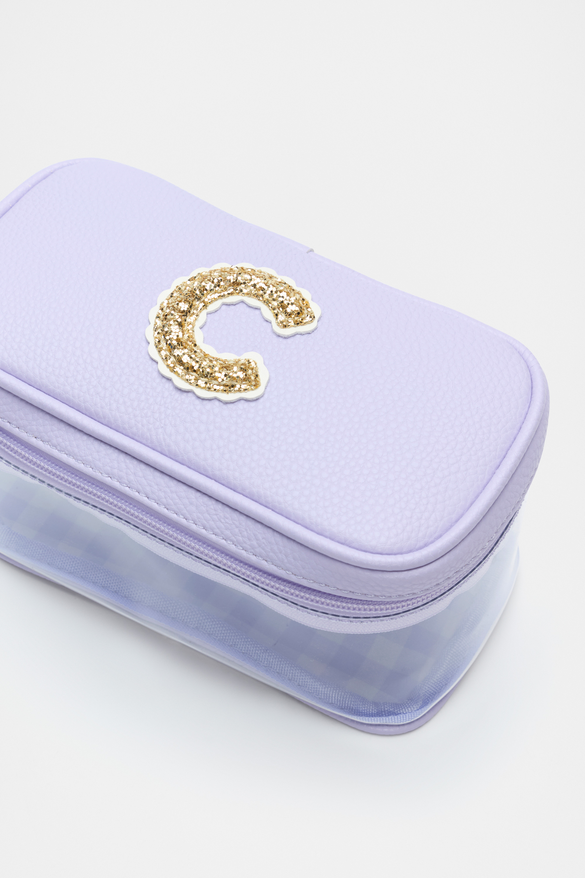 Ideal to keep her things together, this cosmetics bag is detailed with a glitter initial making it the perfect personalised gift. It features a clear design with a zipped lid closure, soft gold hardware and an internal gingham design. It also has a branded carry handle
