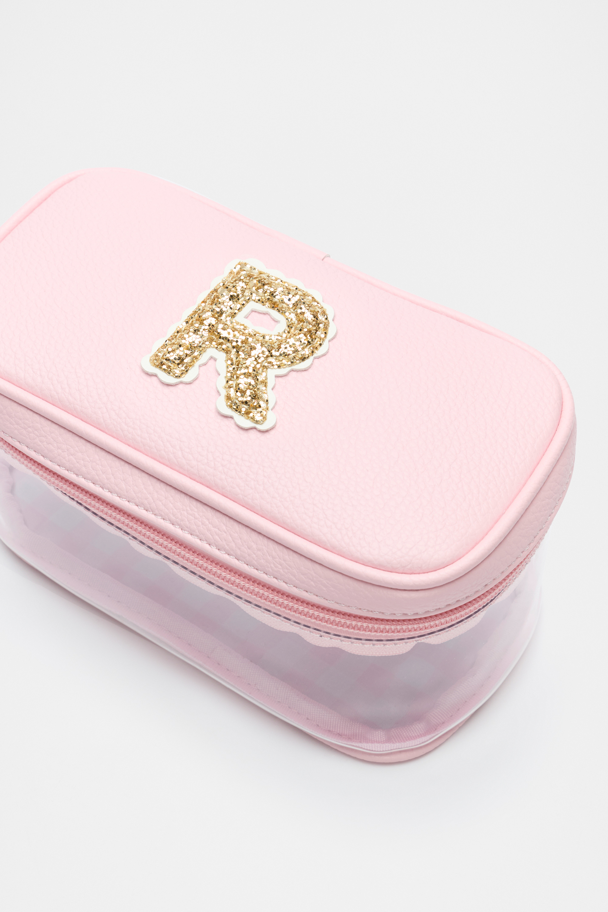 Ideal to keep her things together, this cosmetics bag is detailed with a glitter initial making it the perfect personalised gift. It features a clear design with a zipped lid closure, soft gold hardware and an internal gingham design. It also has a branded carry handle