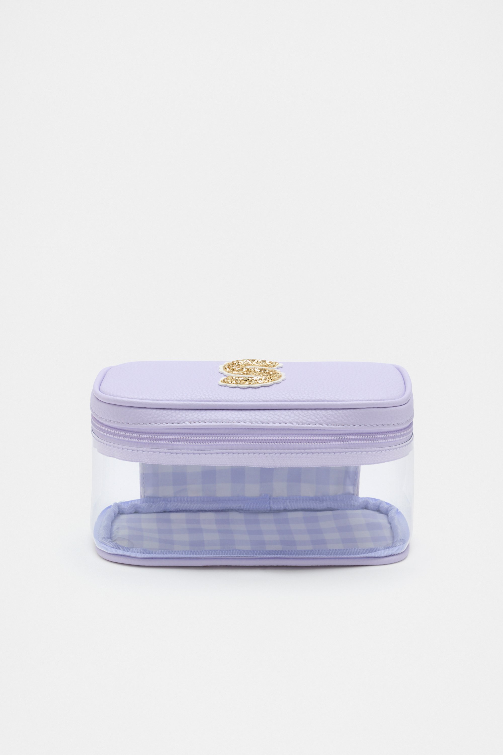 Ideal to keep her things together, this cosmetics bag is detailed with a glitter initial making it the perfect personalised gift. It features a clear design with a zipped lid closure, soft gold hardware and an internal gingham design. It also has a branded carry handle