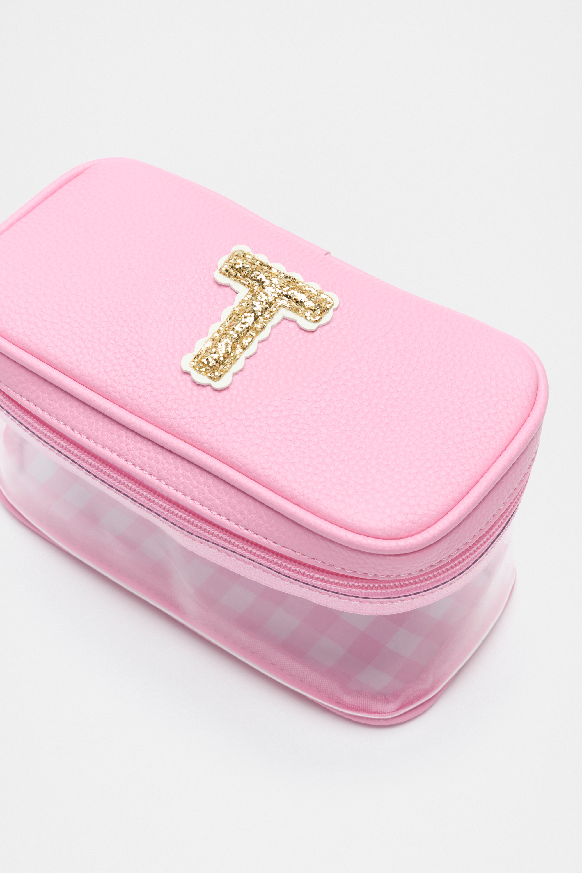 Ideal to keep her things together, this cosmetics bag is detailed with a glitter initial making it the perfect personalised gift. It features a clear design with a zipped lid closure, soft gold hardware and an internal gingham design. It also has a branded carry handle