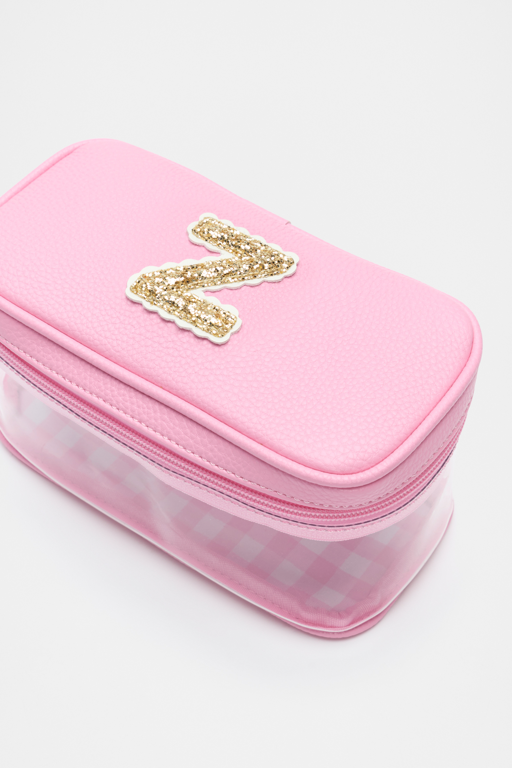 Ideal to keep her things together, this cosmetics bag is detailed with a glitter initial making it the perfect personalised gift. It features a clear design with a zipped lid closure, soft gold hardware and an internal gingham design. It also has a branded carry handle