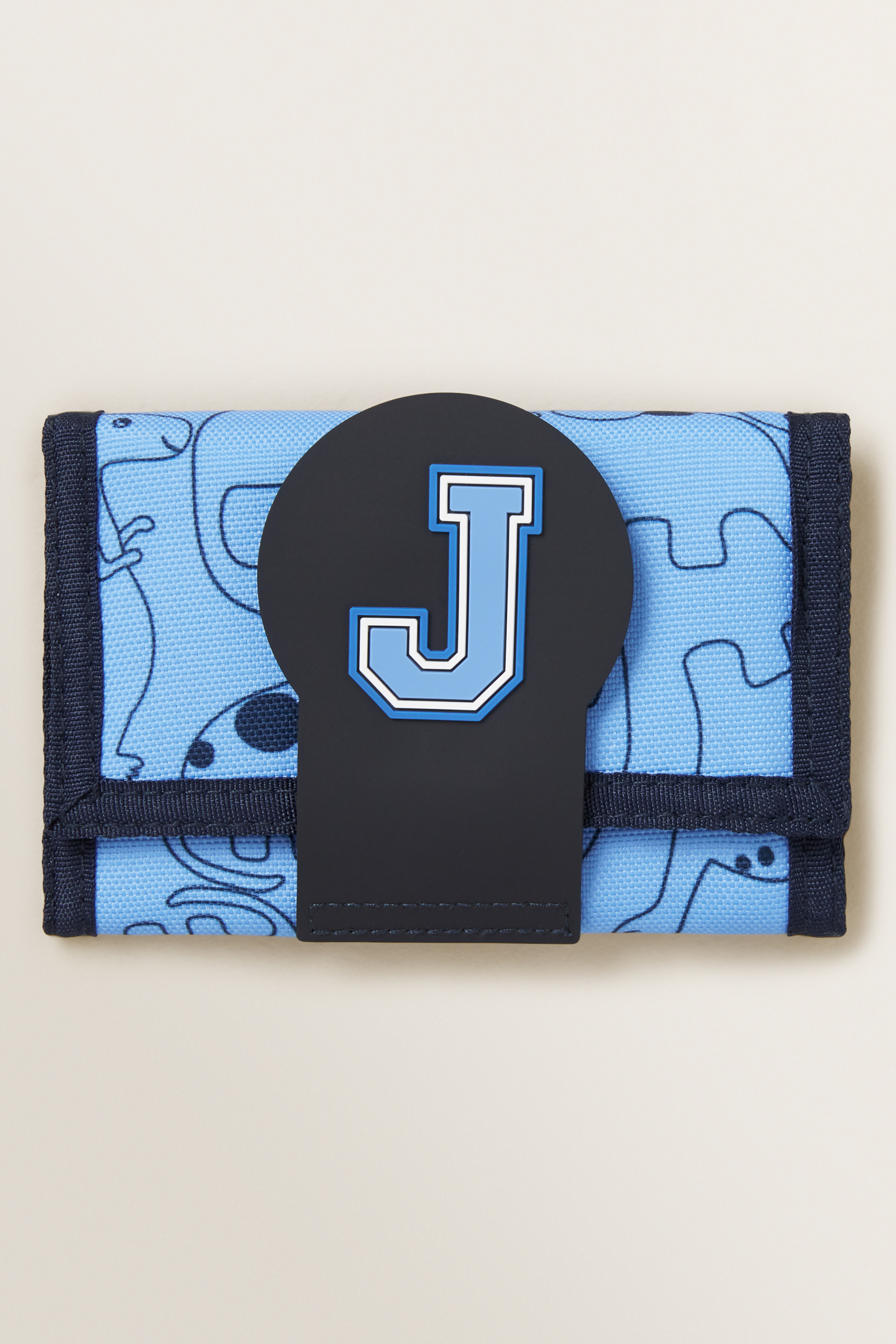 Personalise his accessory collection, with this Initial Wallet. Featuring a sweet dinosaur yardage print, this wallet is detailed with a bold initial, internal compartments and velcro closure.