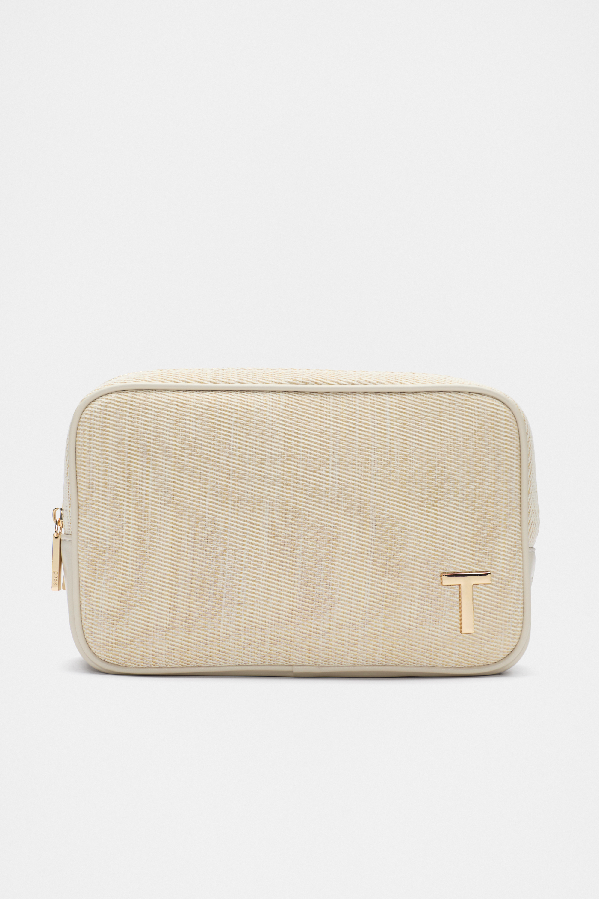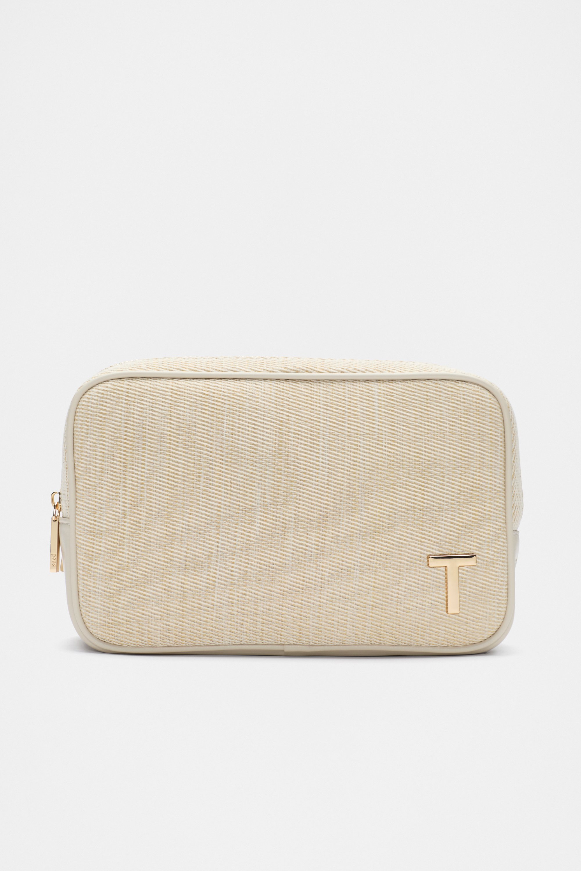 Convenient and the ideal size for the essentials, this make up bag has a structured shape, a zip closure, and a metallic initial detail for a touch of personality. It also has a unique textured finish.