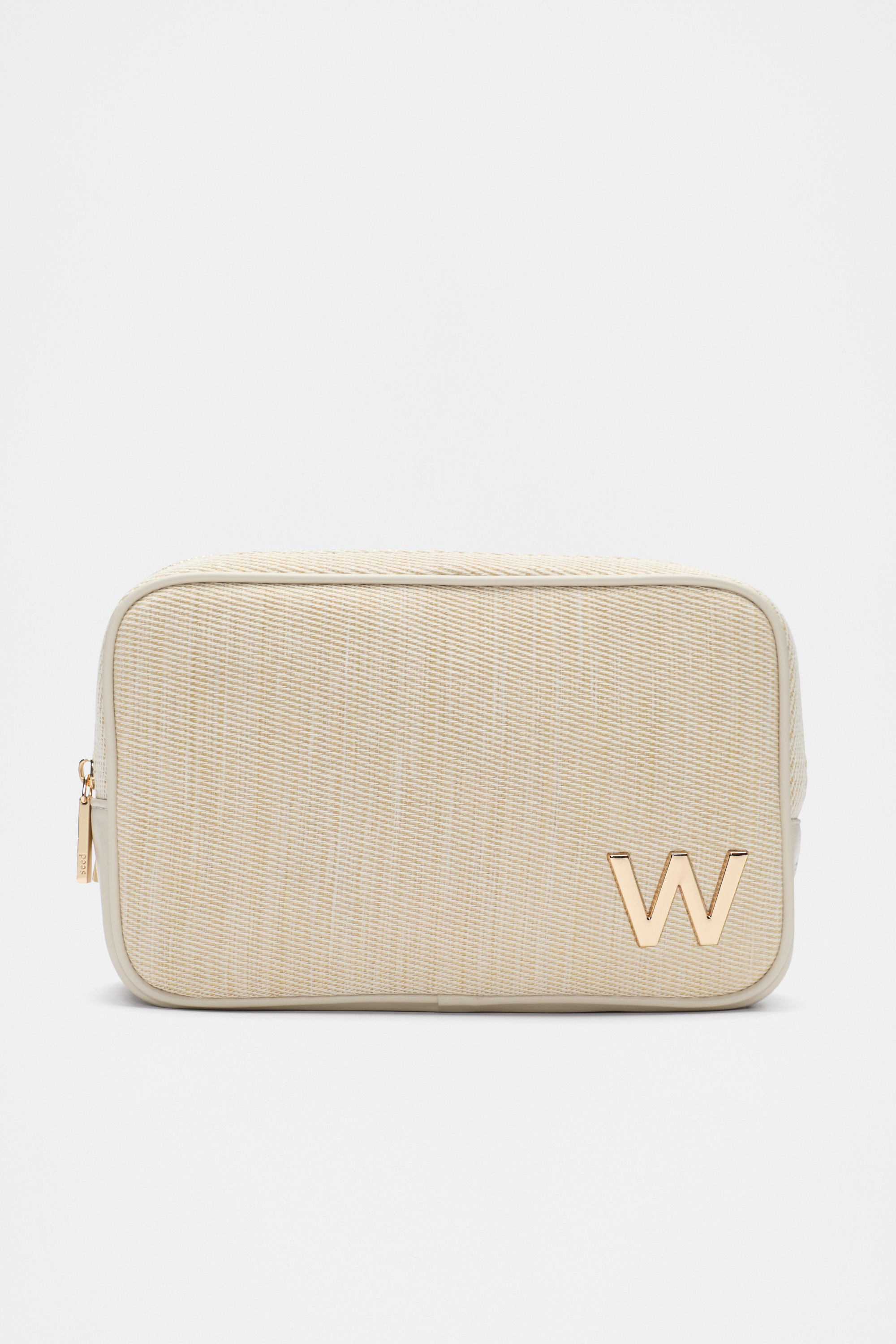 Convenient and the ideal size for the essentials, this make up bag has a structured shape, a zip closure, and a metallic initial detail for a touch of personality. It also has a unique textured finish.
