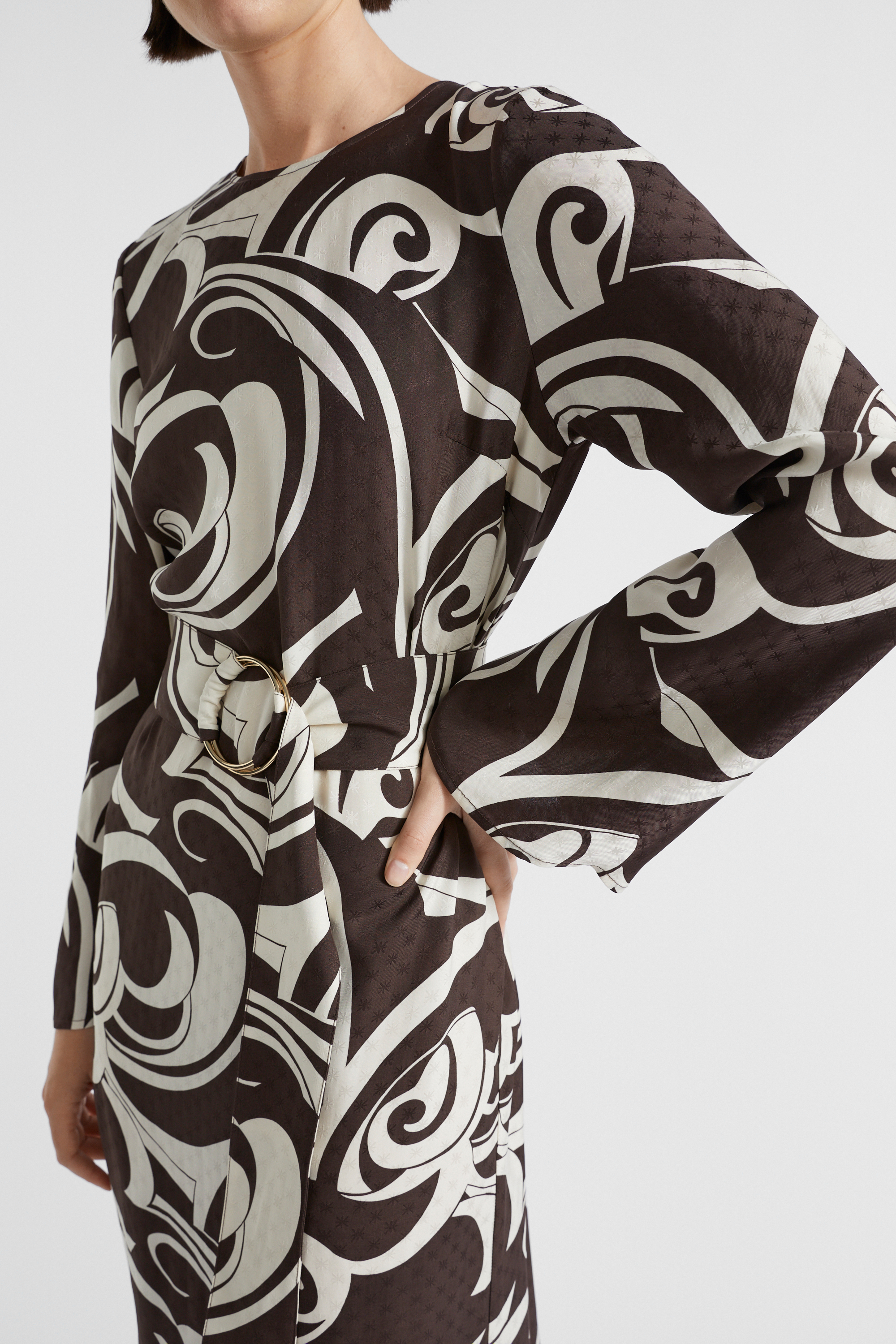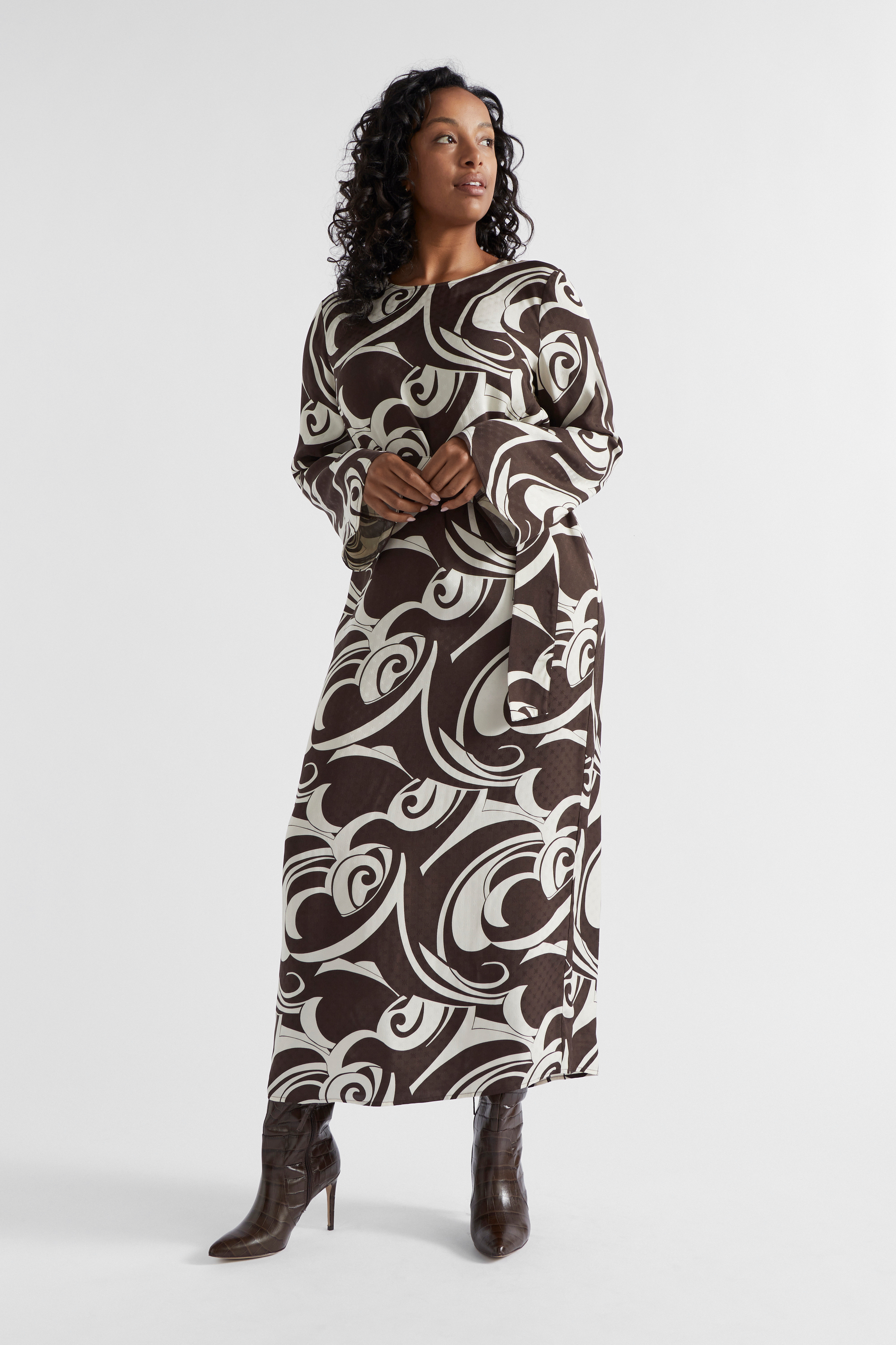 An instant retro-feel outfit, this midi dress is ideal for your next event. It features a round neck, a rear invisible zip, long fluted sleeves, a self-tie with a double ring closure, and a retro swirl pattern. The skirt flares out towards the hem, with a split at the rear for movement.