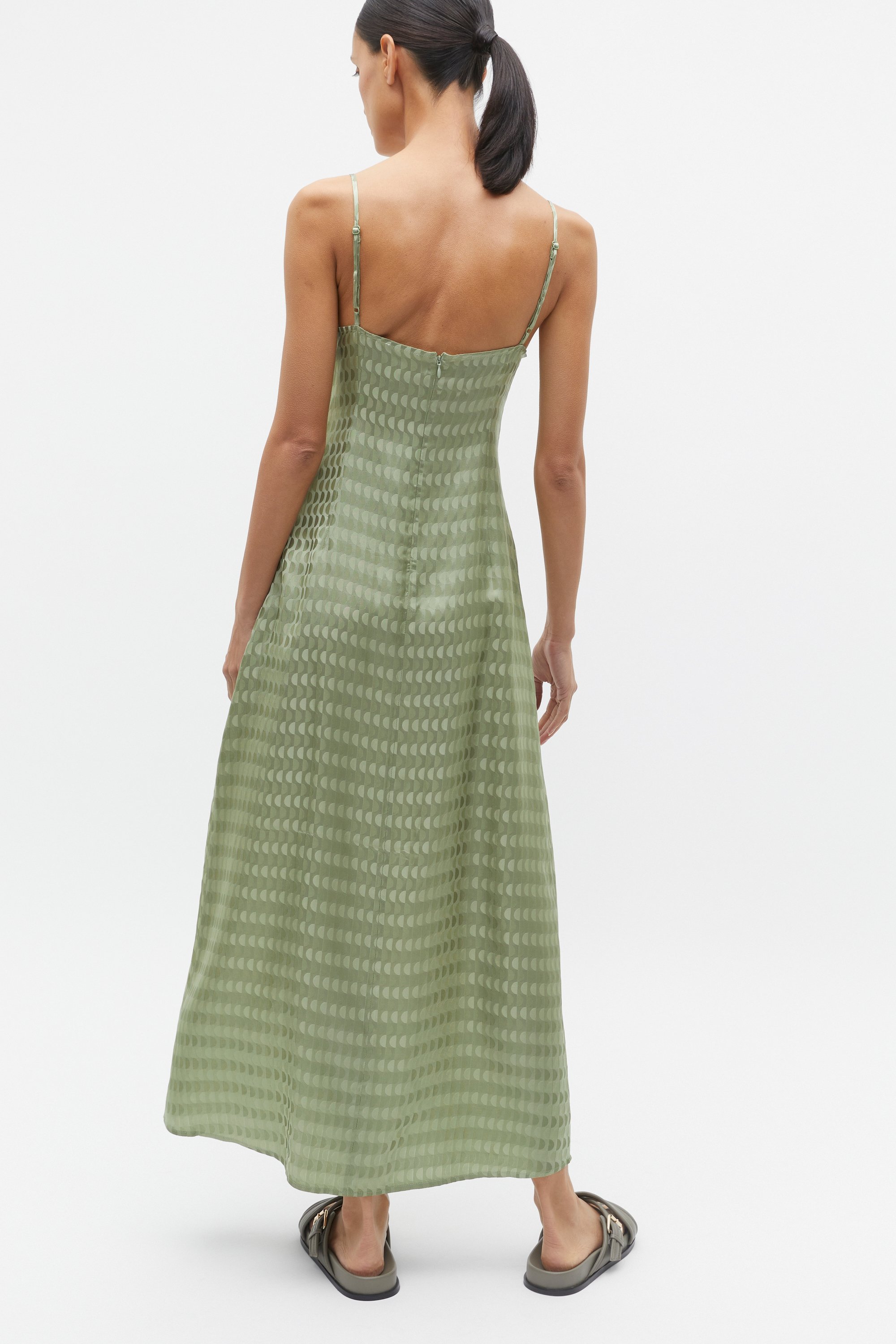 In a fluid cupro blend with a jacquard pattern, this midi dress is set to be your new favourite. It features adjustable thin straps, a twist front detail, a rear invisible zip, and a slight A-line shape to the skirt.