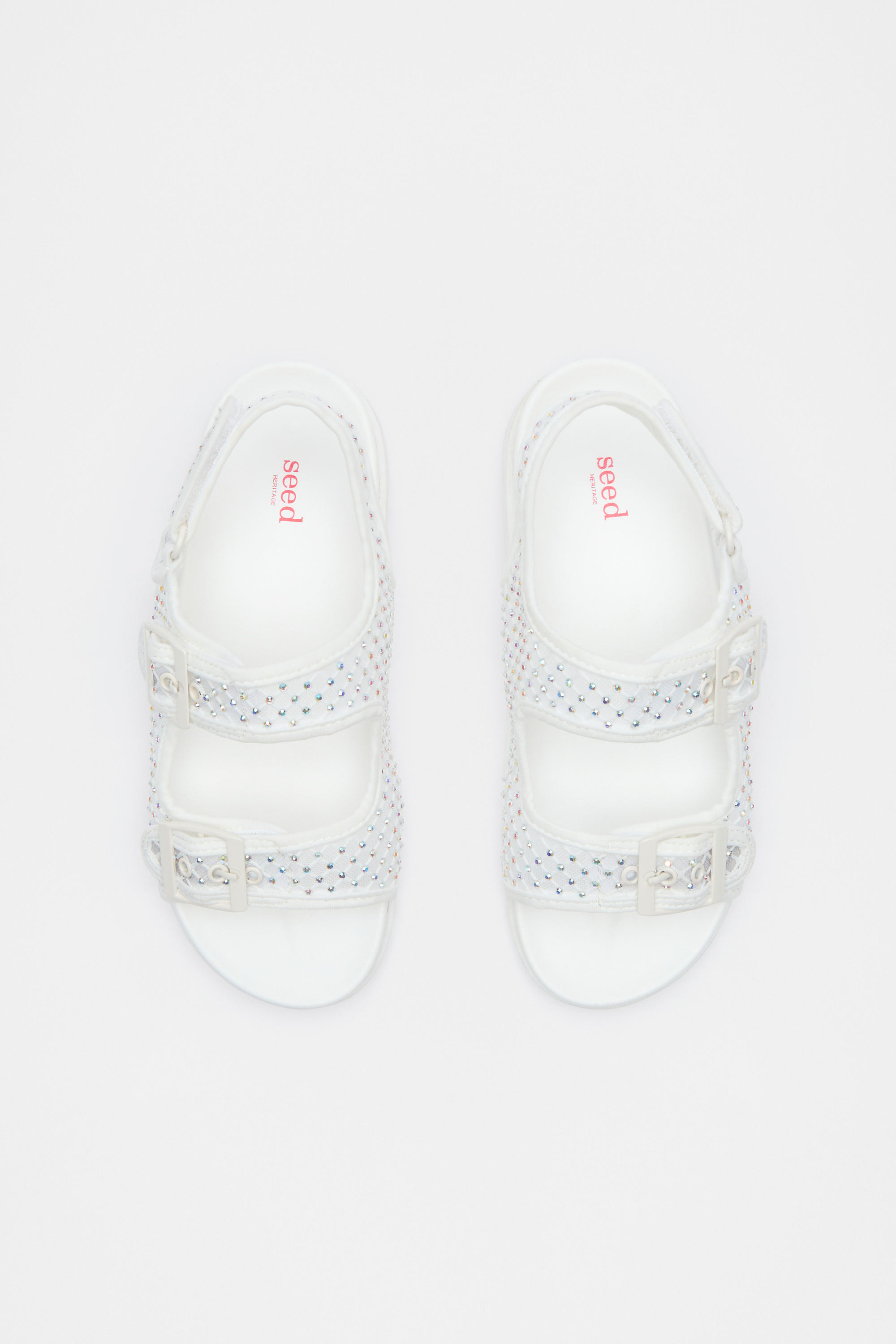Sparkly and fun, these sandals are finished in a jewel mesh, and feature a double buckle design securing with a hook-and-loop closure around the ankle.