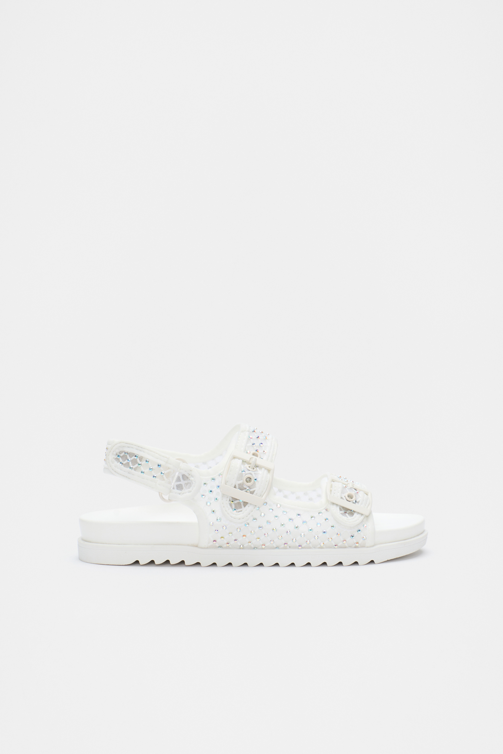 Sparkly and fun, these sandals are finished in a jewel mesh, and feature a double buckle design securing with a hook-and-loop closure around the ankle.
