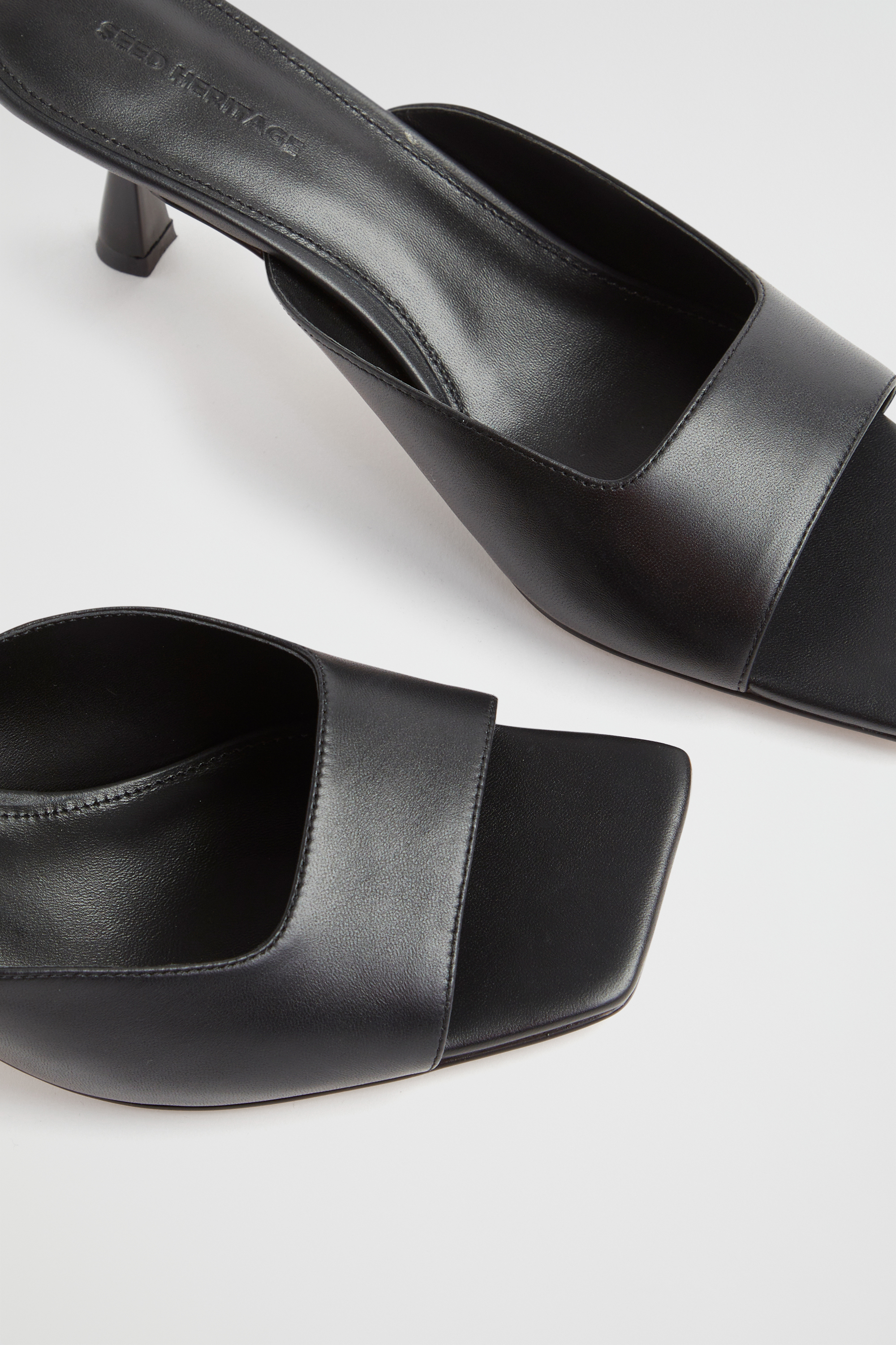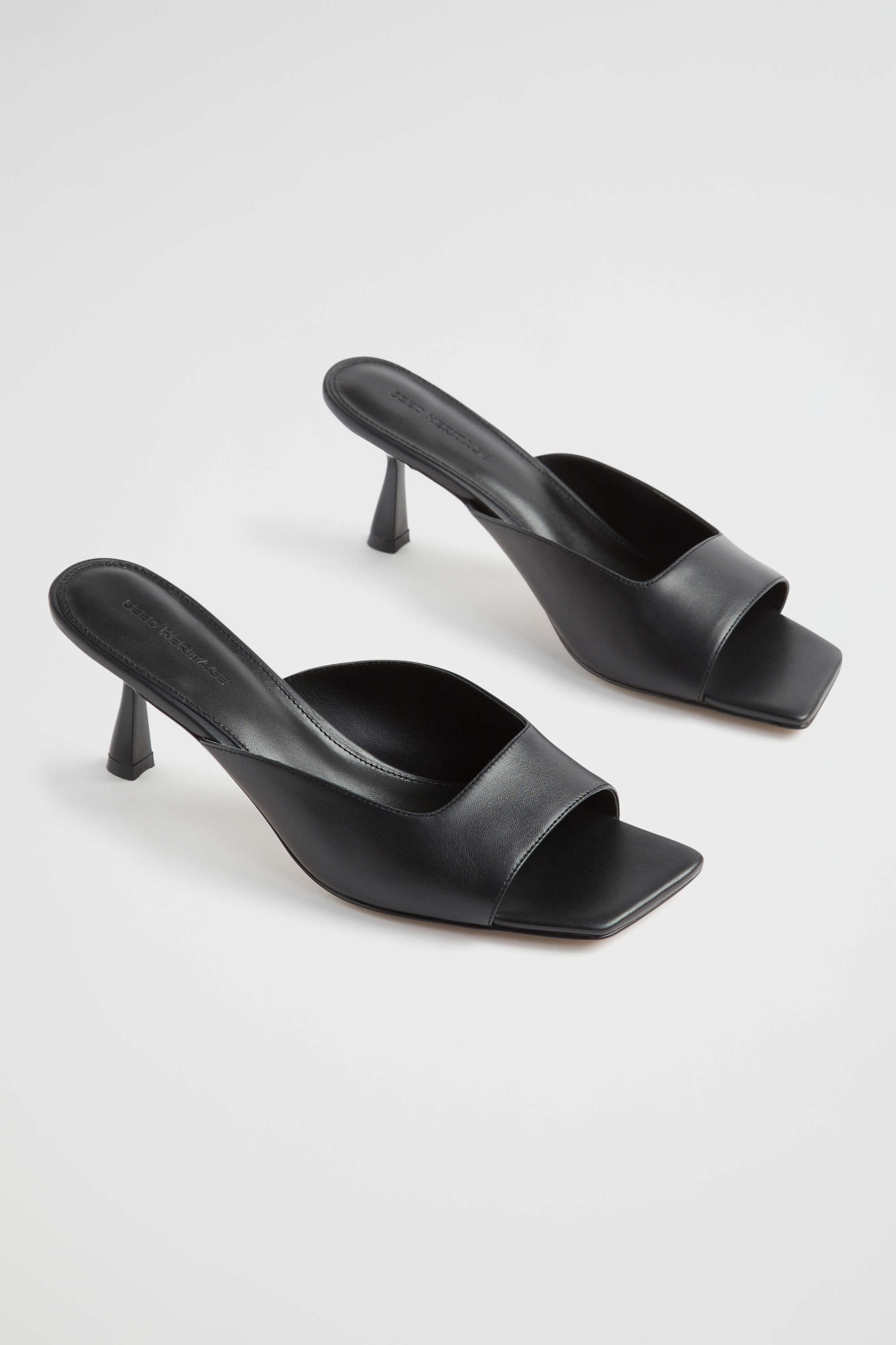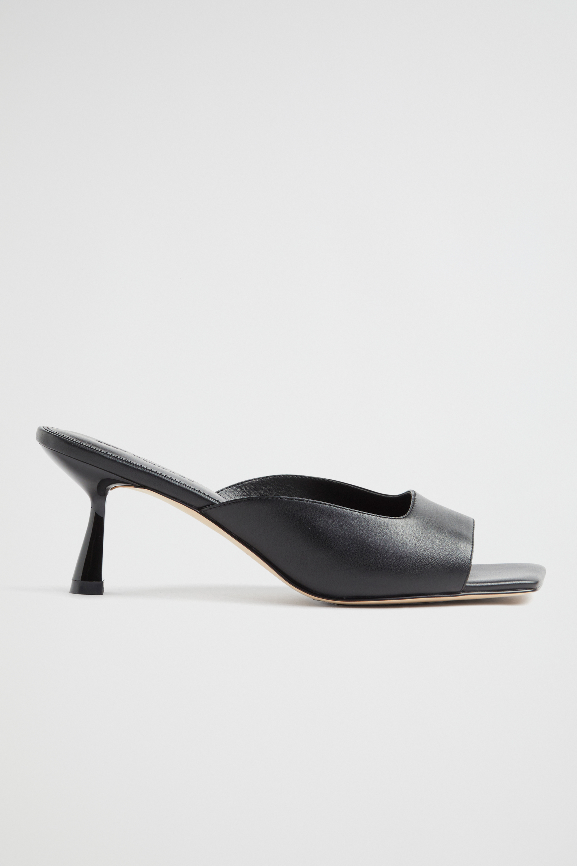 These mules have a minimal, elegant look, ideal for styling with dresses and suiting. They feature a peep toe, and an elegant, offset heel. The