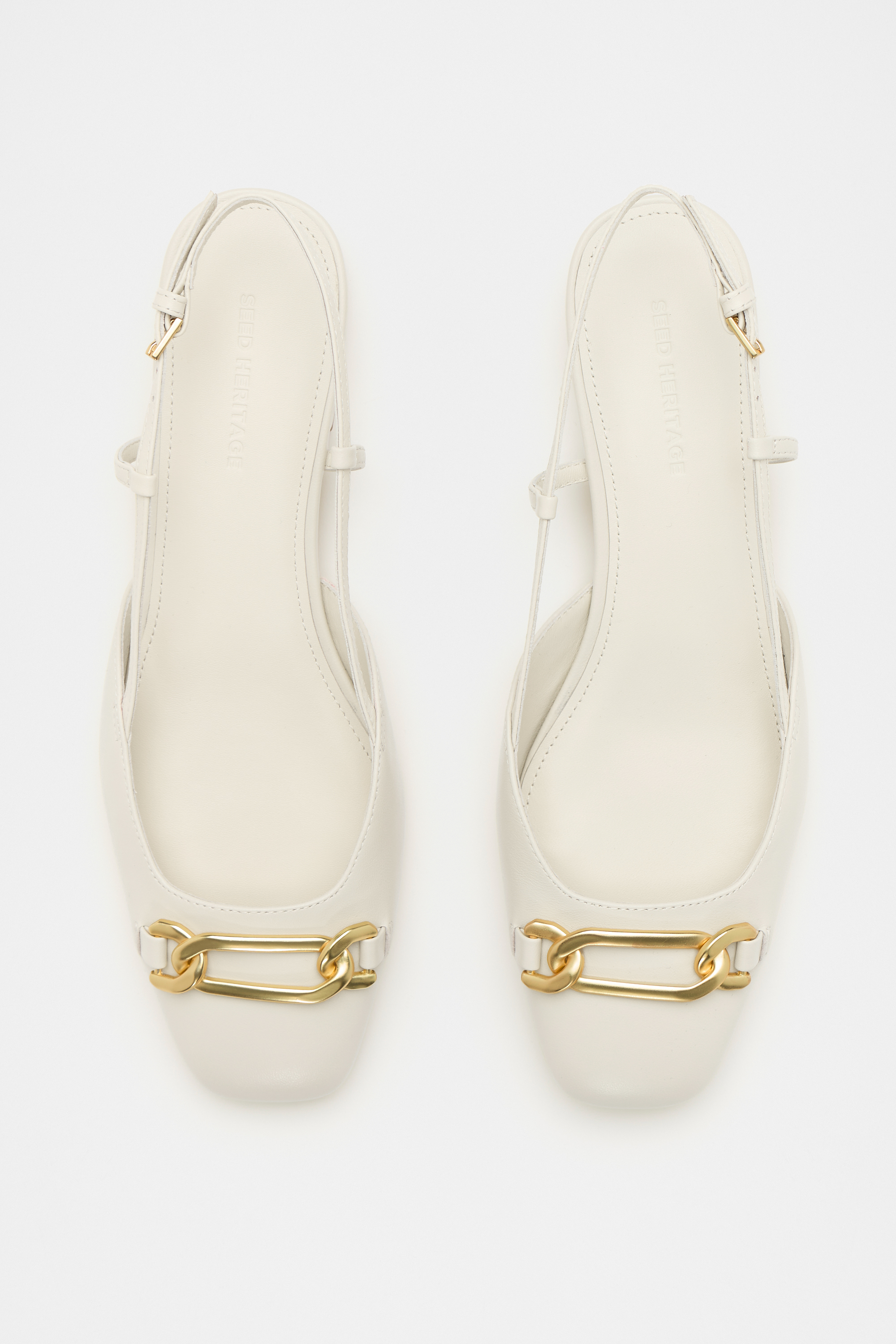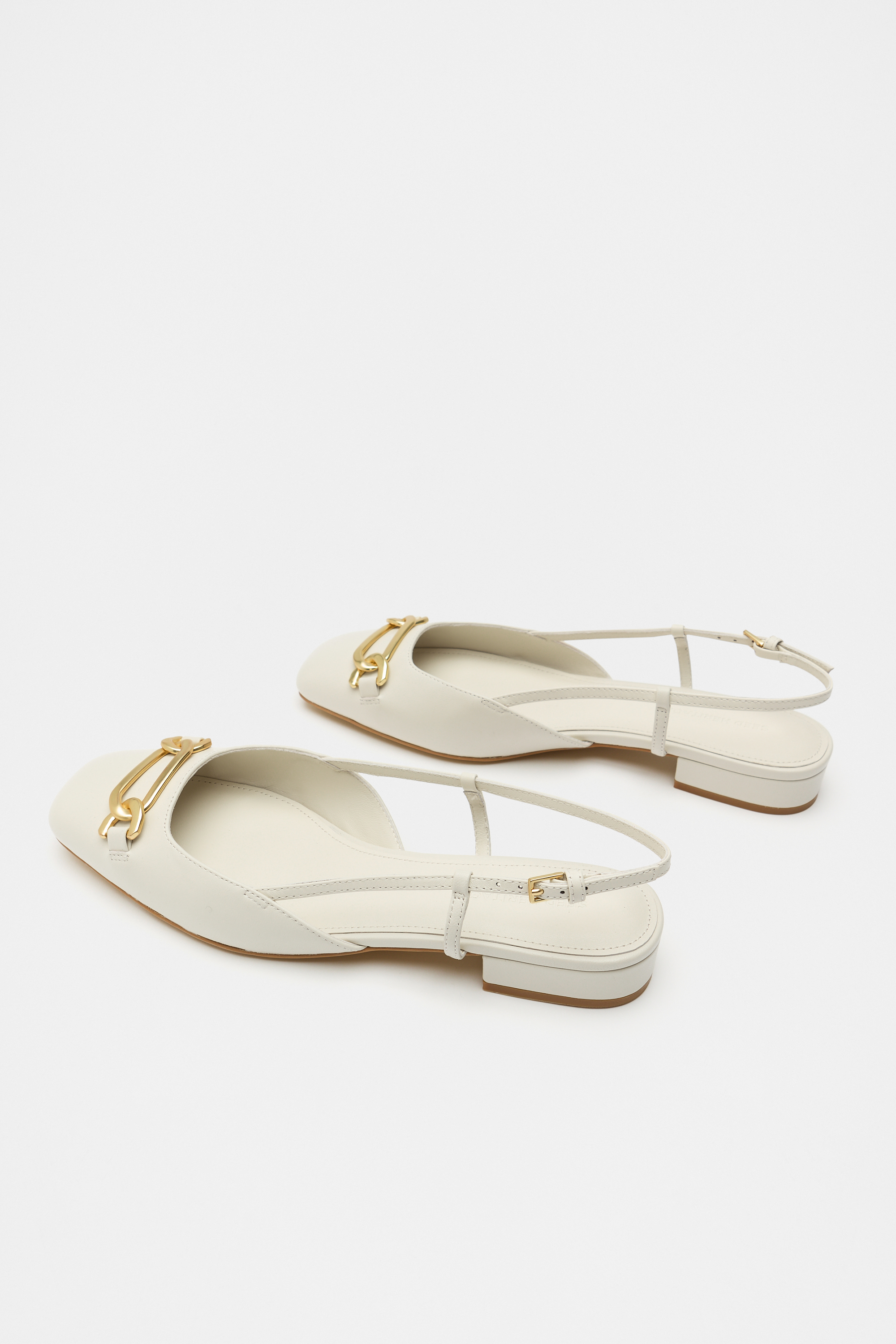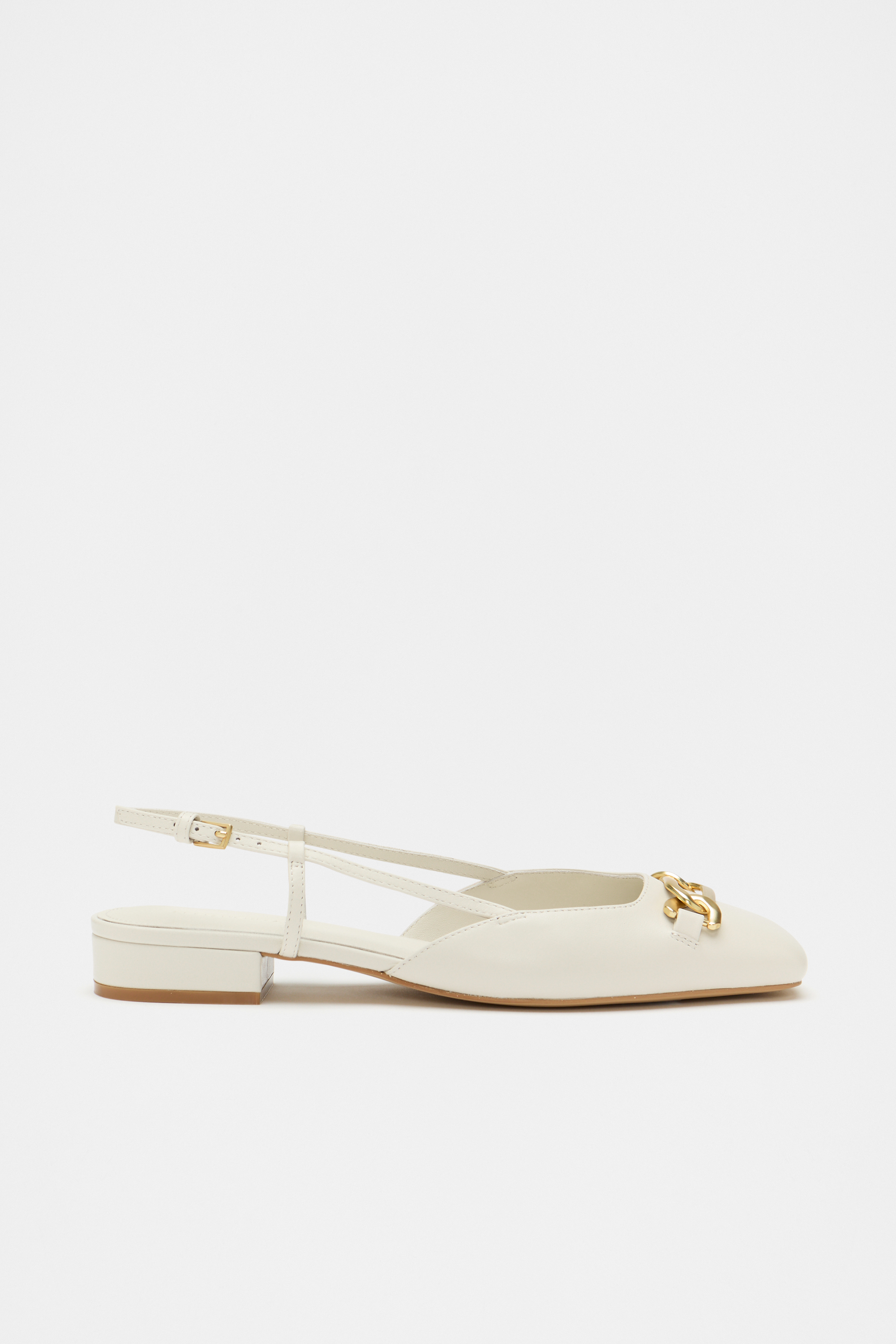 Add a subtle statement to your next outfit with these flats, crafted from premium leather. They feature a slingback style with an adjustable strap, a rounded toe, coated hardware, and a chain detail.