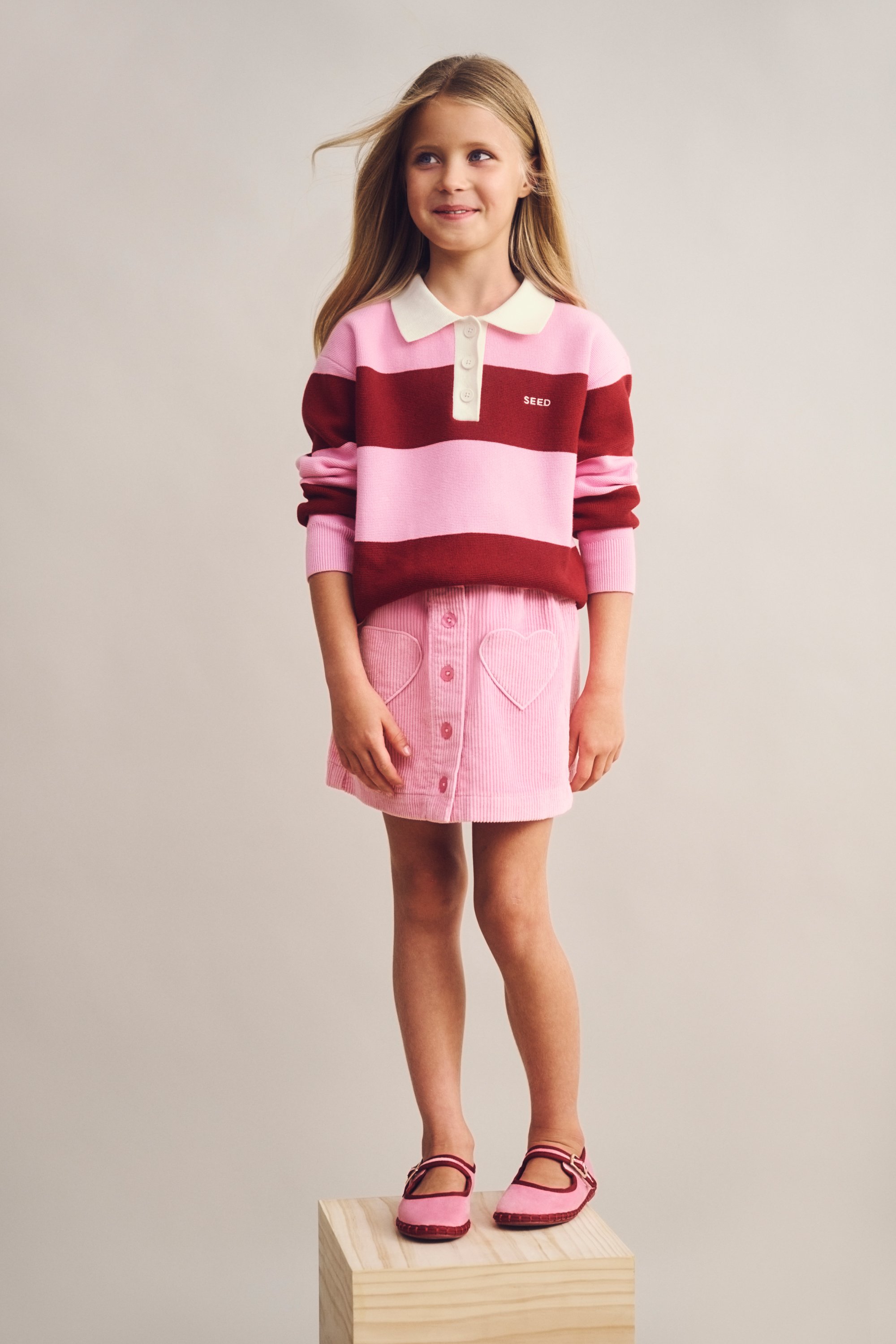 This knit jumper is a classic rugby style, and a comfortable layer for her wardrobe. Crafted in premium cotton with a soft knit finish, it features a bold stripe design as well as a contrast collar with a button placket and ribbed detailing at the trims.