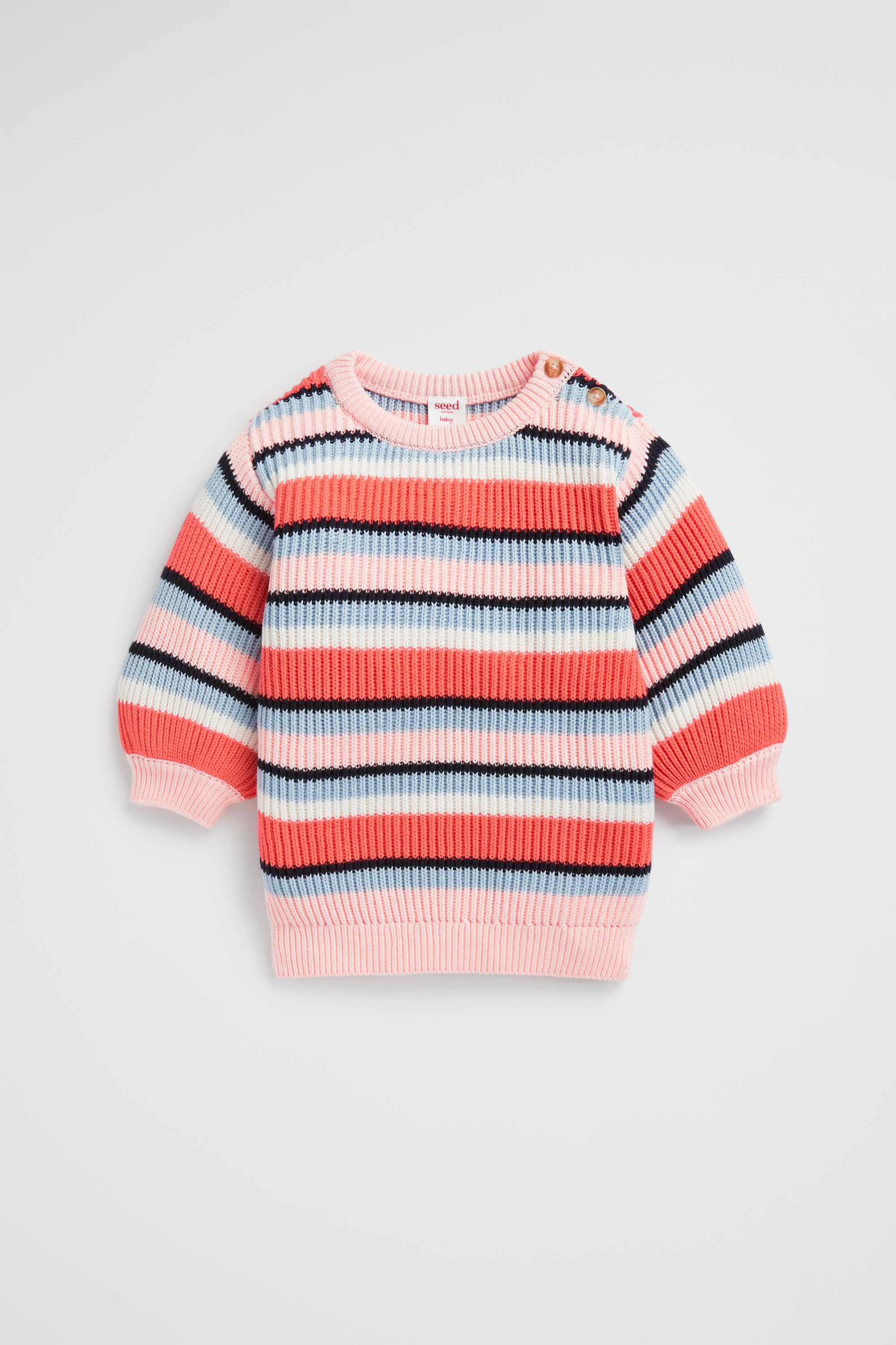 This knit dress has a ribbed feel and a sweet, colourful stripe pattern. With a round neck and shoulder buttons, it is comfortable to wear and ideal for chilly days. Layer up with tights and boots. Crafted from 100% cotton.