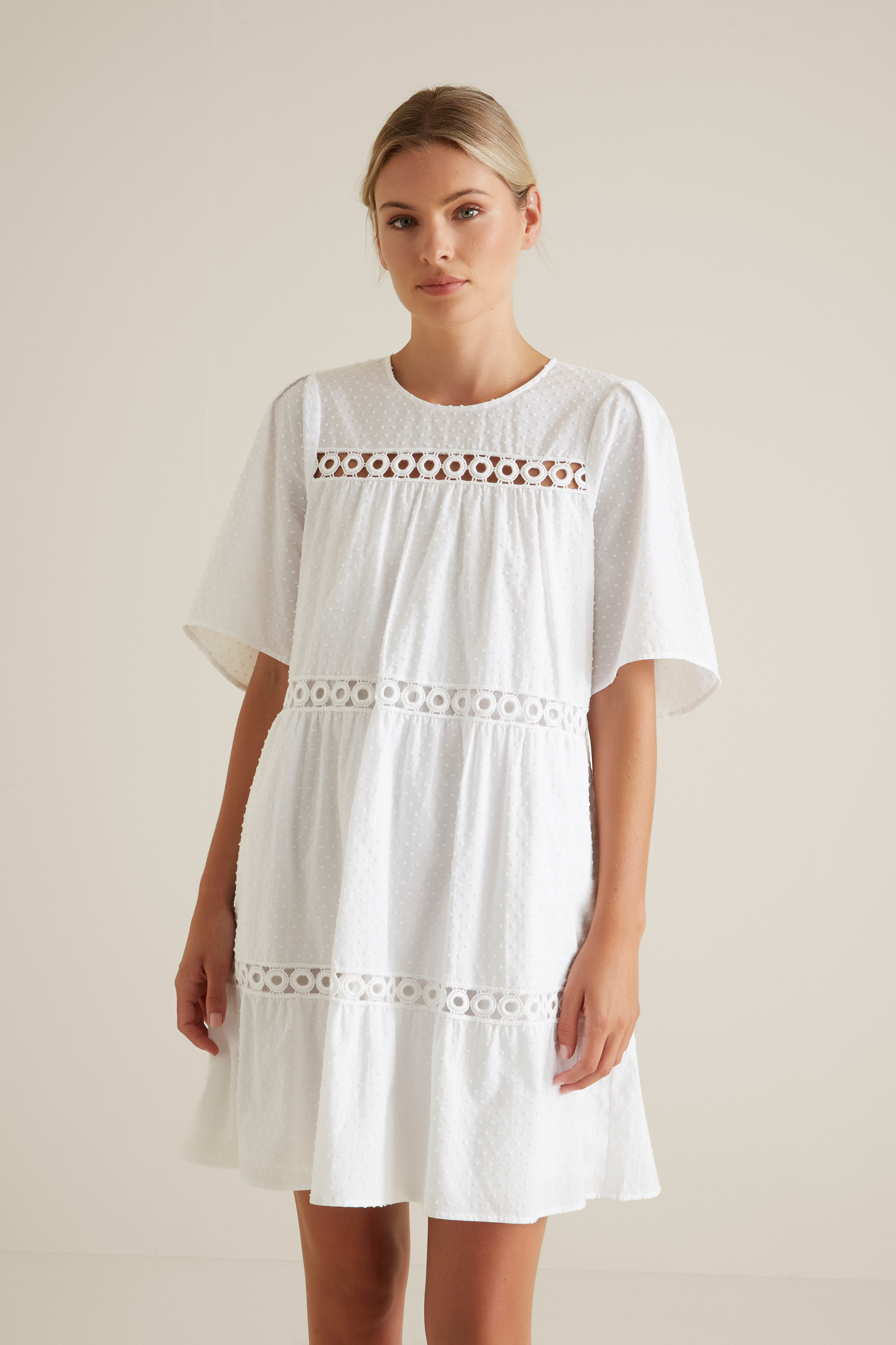 Exuding island getaway charm, this Ladder Trim Dobby Dress boasts a lightweight textured blend, detailed with a crew neckline, button back closure, flutter sleeves, and a tiered silhouette with ladder trims. For your reference, our model is 177 cm tall and wears a size 8. Check the label inside of the garment for care instructions.