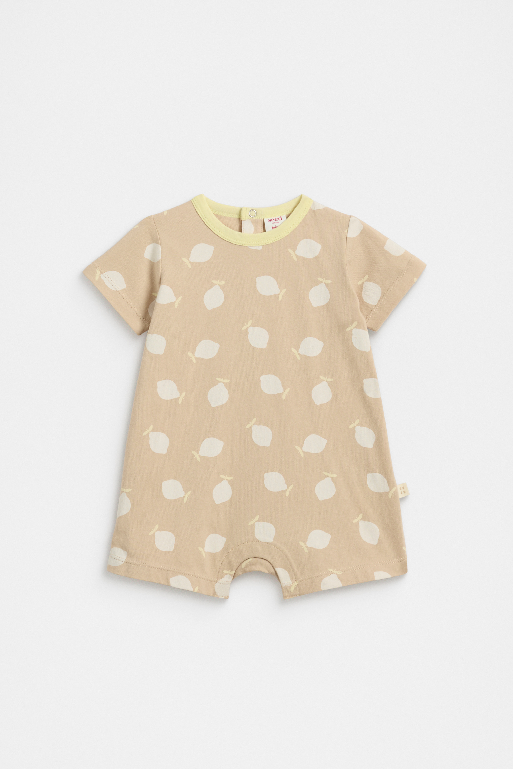 This playfully sweet romper is an adorable option for their summer wardrobe. Crafted in premium cotton, it's a loose fitting style and features a round neck, short sleeves, and the cutest all-over lemon design. Secures with snaps at the back of the neck and with snaps at the gusset.