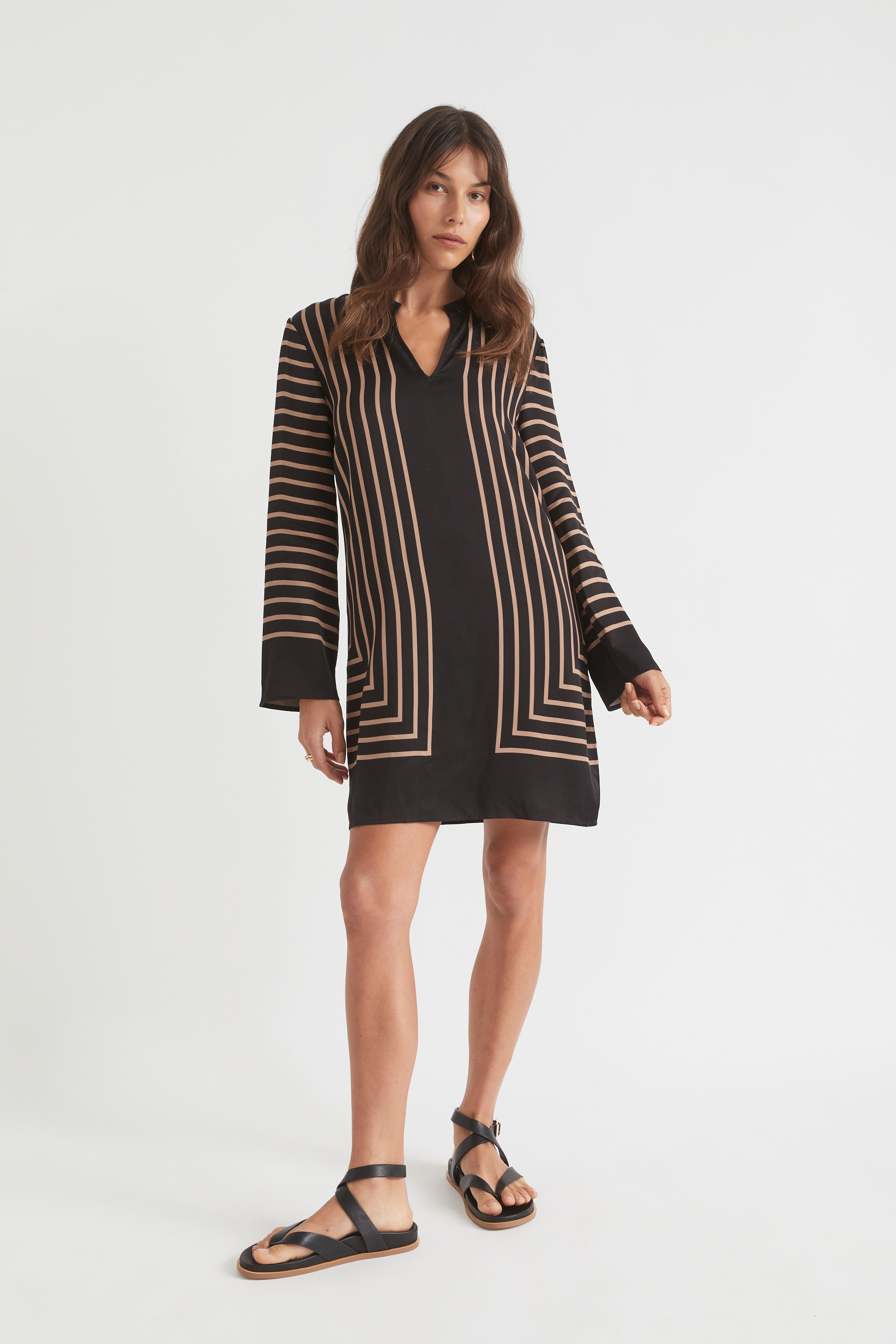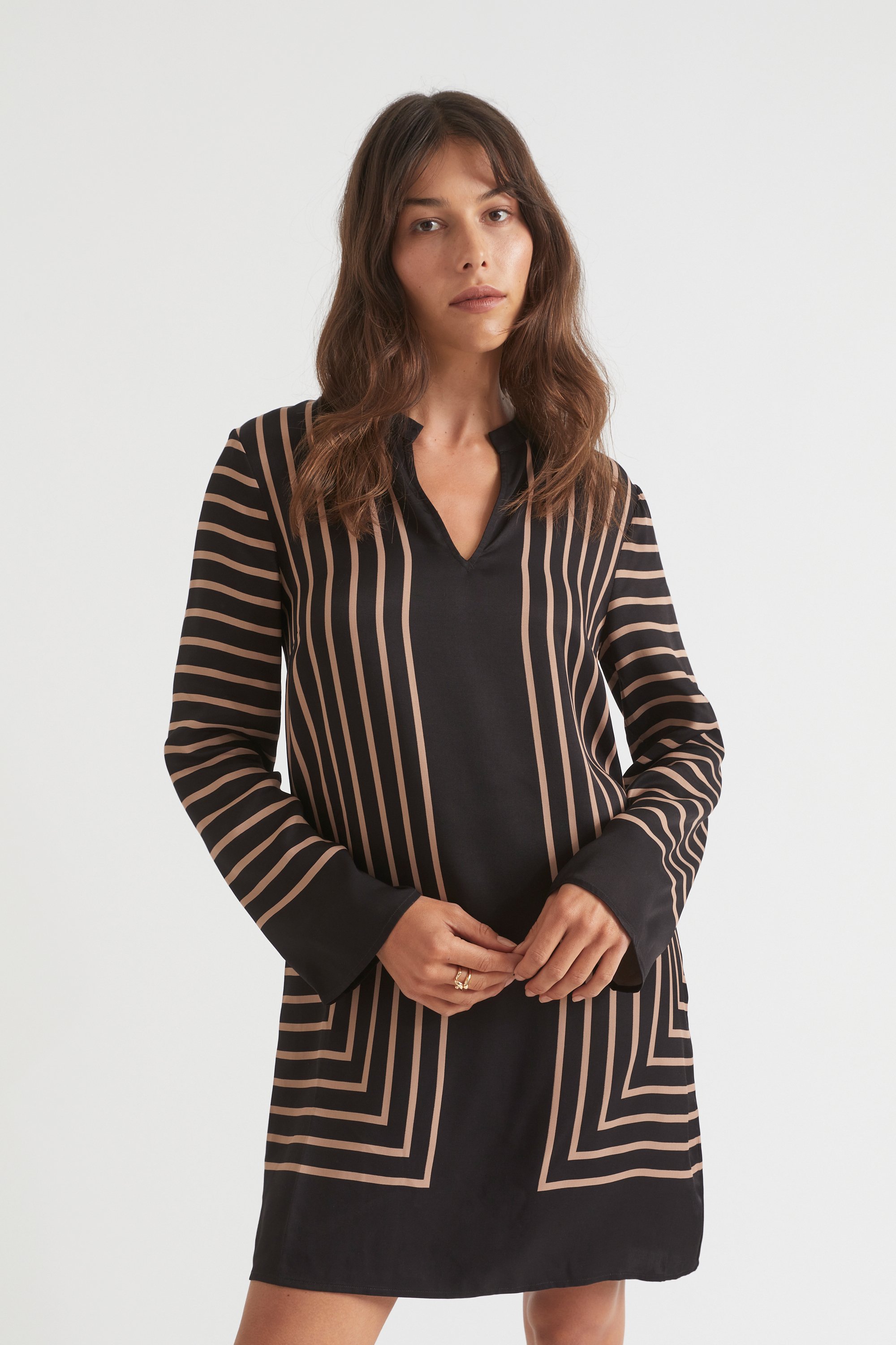 With a standing collar and a classic shift shape, this dress is a work-week staple. Its linear print gives it a modern feel, while its mini length is balanced by long sleeves.